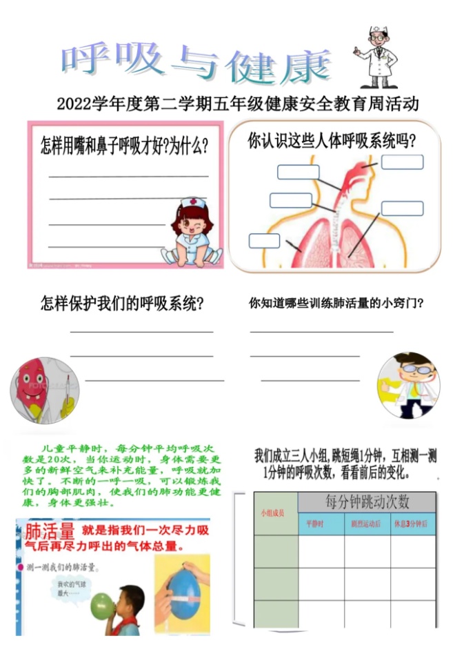 五年级以“呼吸与健康”为主题,通过充满趣味性和探究性的问题讨论,让学生在思辨中学习科学知识,同时也进一步了解了生理卫生教育的内容;通过对比运动前后的脉搏跳动数以及了解肺活量等实践活动,让学生懂得如何呼吸与身体健康有着密不可分的关系。