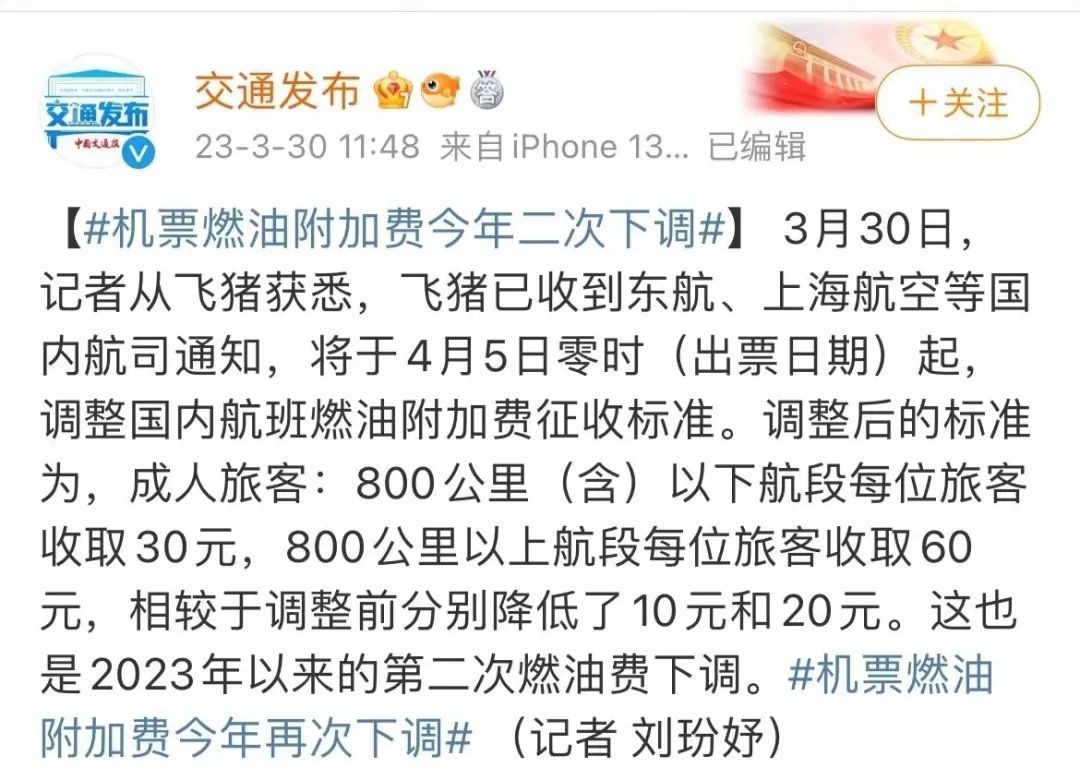 3月30日,记者从飞猪获悉,飞猪已收到东航、上海航空等国内航司通知,将于4月5日零时(出票日期)起,调整国内航班燃油附加费征收标准。调整后的标准为,成人旅客:800公里(含)以下航段每位旅客收取30元,800公里以上航段每位旅客收取60元,相较于调整前分别降低了10元和20元。这也是2023年以来的第二次燃油费下调。