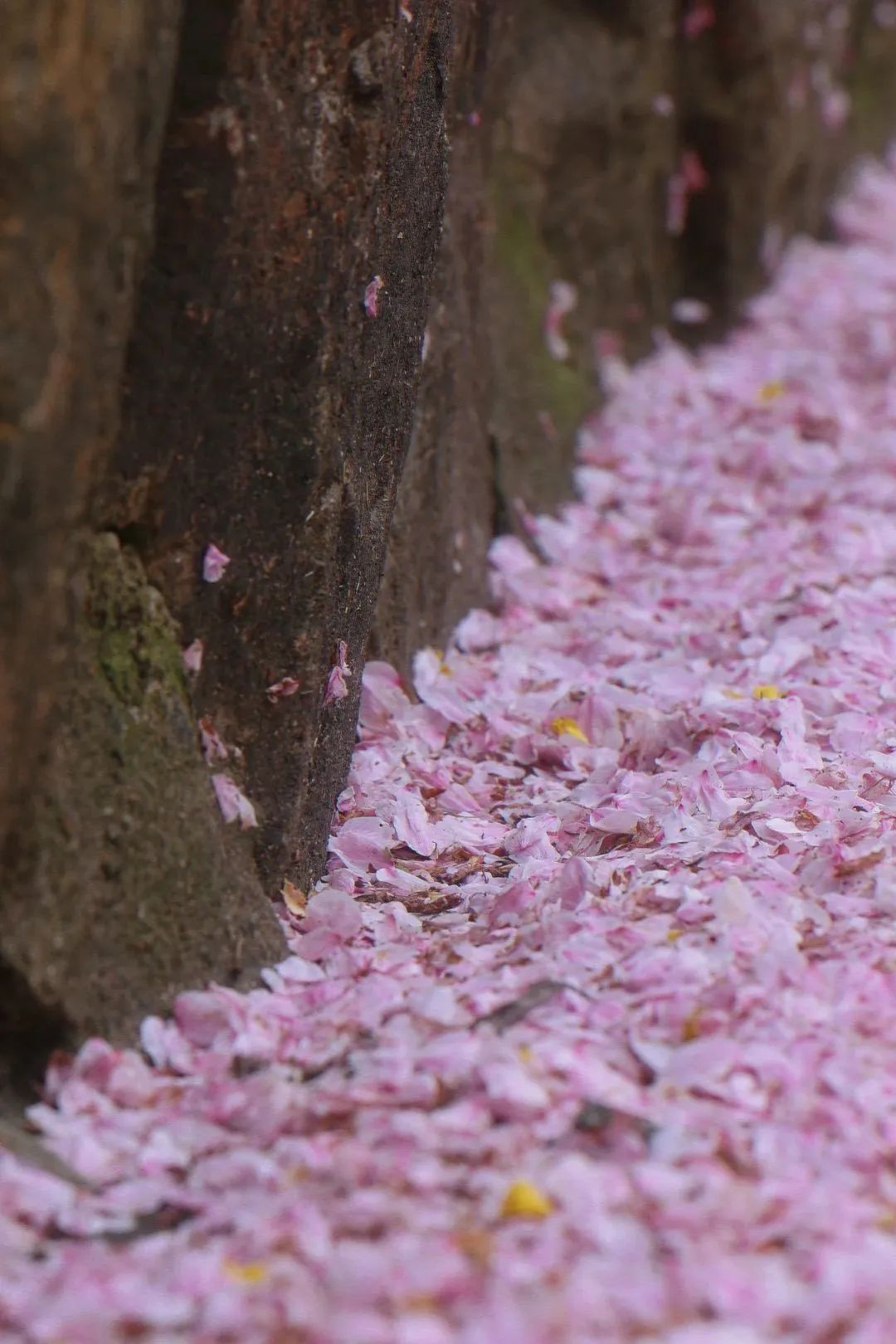 经过一番轰轰烈烈地绽放,这几天,顾村公园的染井吉野已悄然洒下“樱花雨”。徐徐的春风吹过,花瓣如同雨点纷纷飘落,为大地铺上一层柔软的粉色地毯。