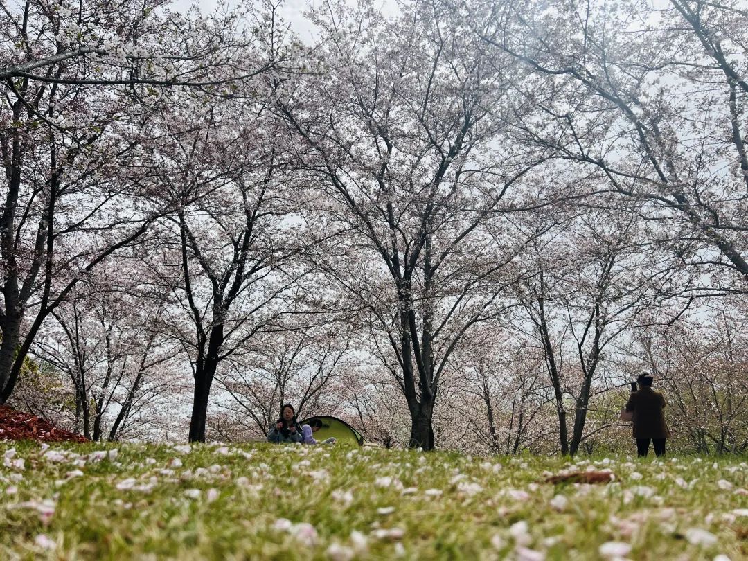 樱花树下,市民游客有的支起帐篷享受悠闲时光,有的拿出手机定格下落美景分享给好友,还有的穿着素雅的古风服装,拍照、打卡、留念。