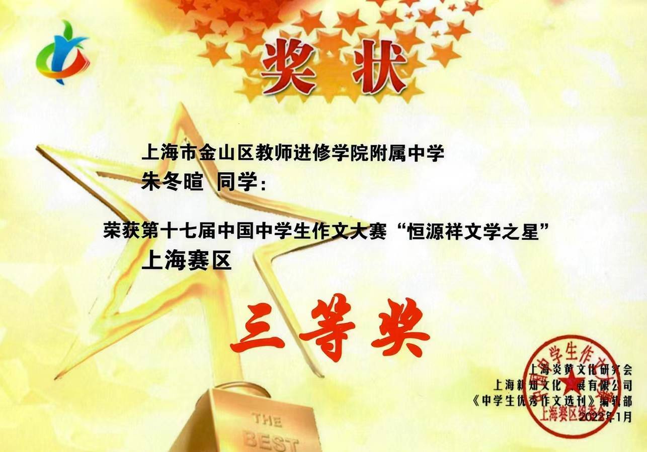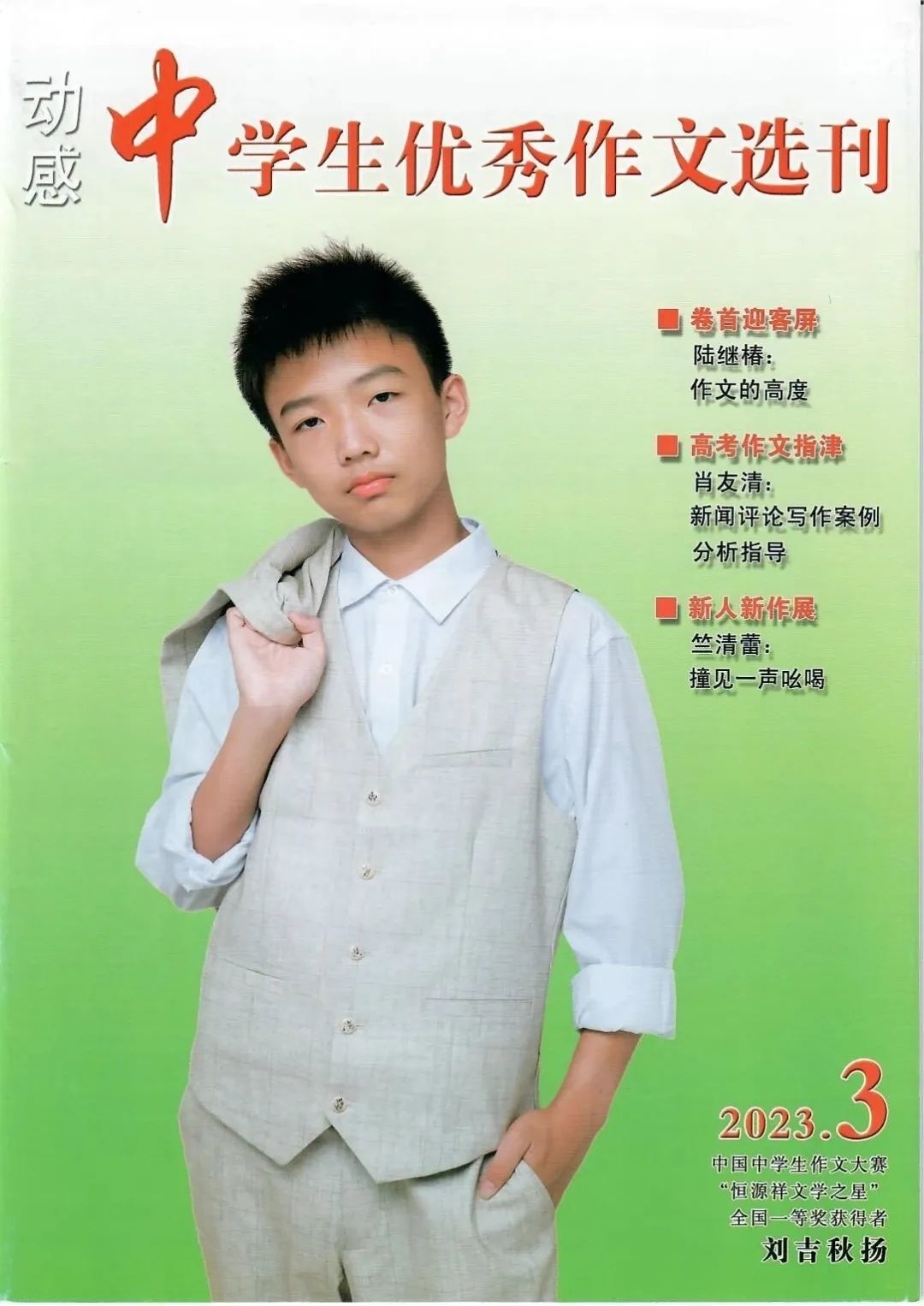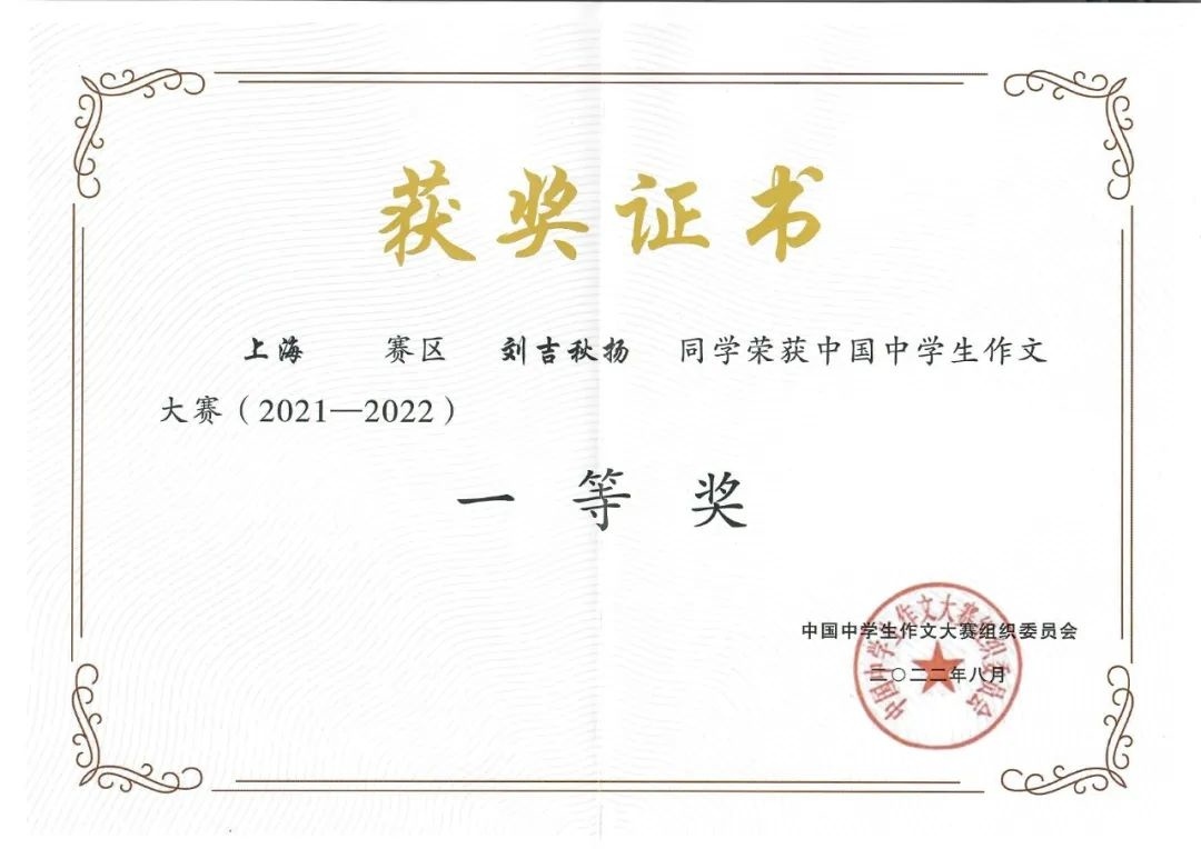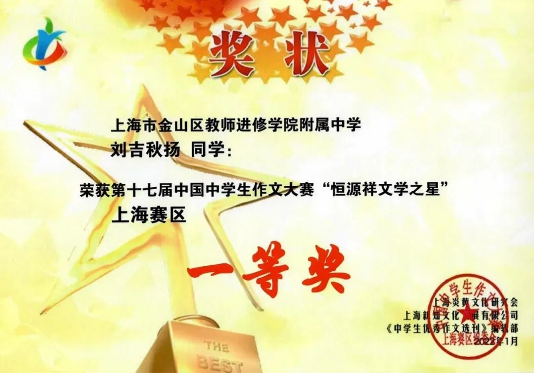 中国中学生作文大赛“恒源祥文学之星”全国一等奖、中国中学生作文大赛“恒源祥文学之星”上海赛区一等奖、全国中学生英语翻译大赛(八年级)国家三等奖、全国中学生英语作文大赛(七年级)省级一等奖……这些是金山区教师进修学院附属中学初三学生刘吉秋扬近几年在写作方面取得的成绩。近期,他还登上了《中学生优秀作文选刊》的杂志封面!