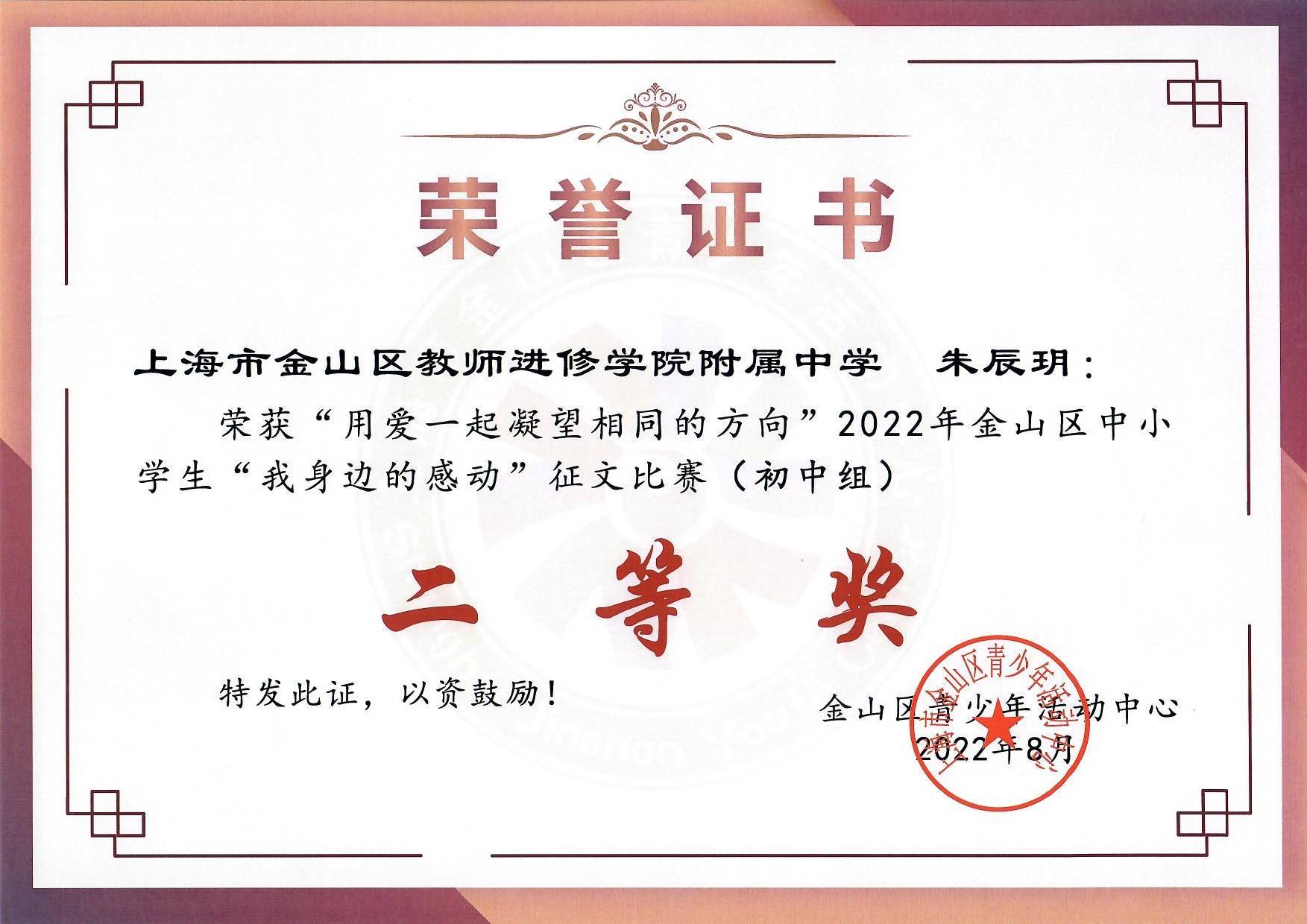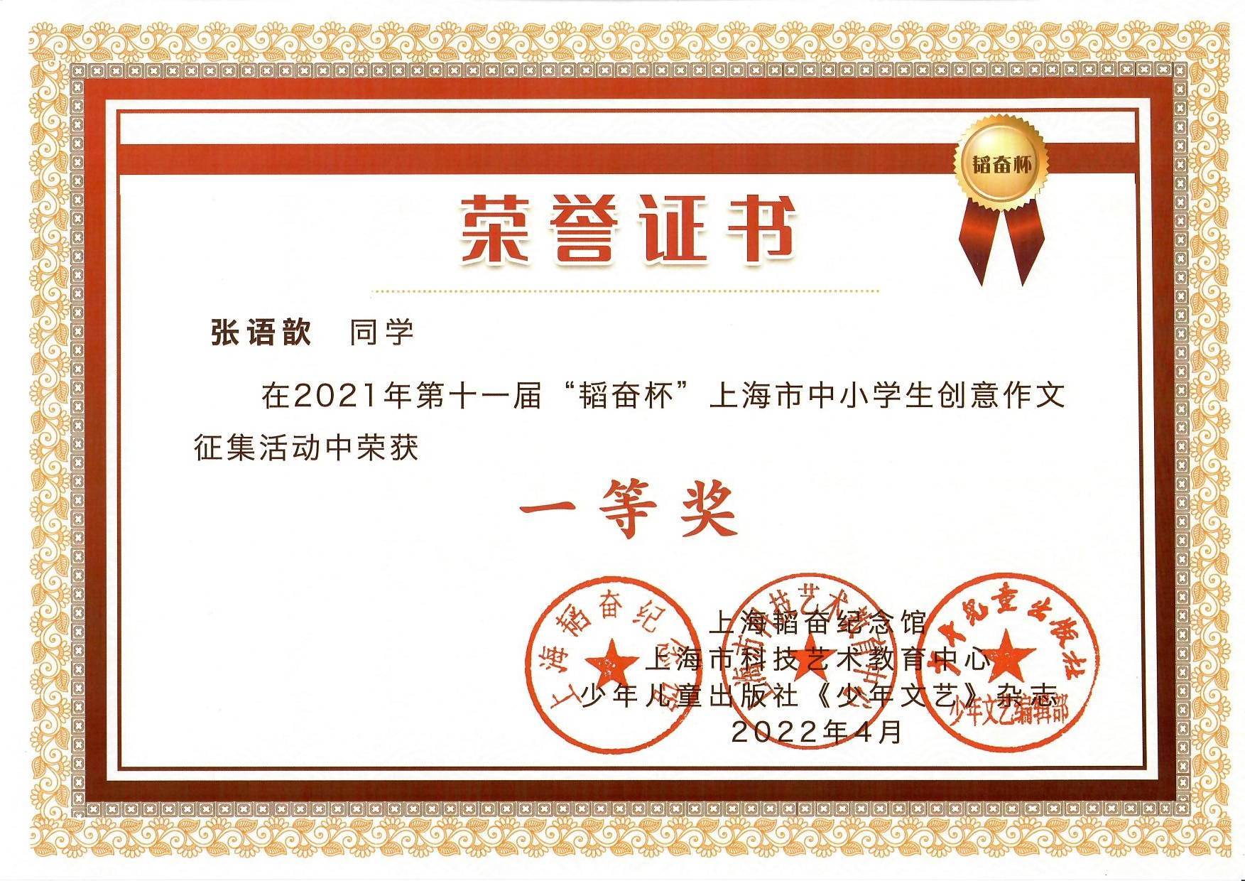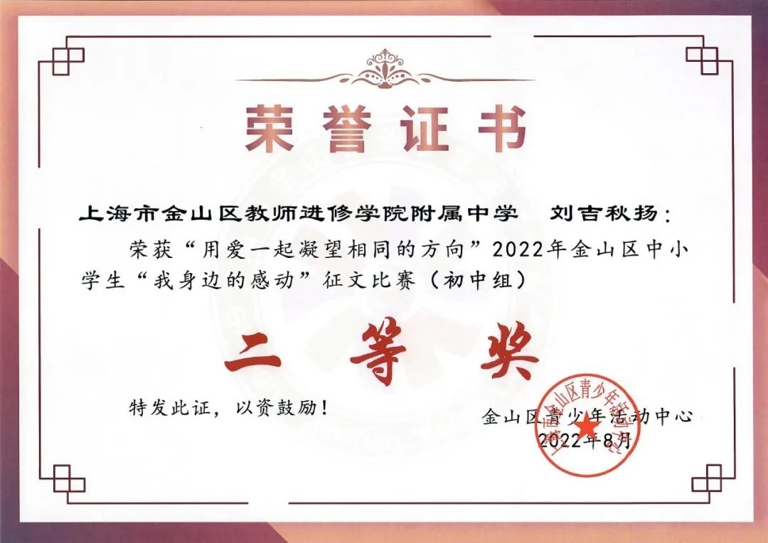 中国中学生作文大赛“恒源祥文学之星”全国一等奖、中国中学生作文大赛“恒源祥文学之星”上海赛区一等奖、全国中学生英语翻译大赛(八年级)国家三等奖、全国中学生英语作文大赛(七年级)省级一等奖……这些是金山区教师进修学院附属中学初三学生刘吉秋扬近几年在写作方面取得的成绩。近期,他还登上了《中学生优秀作文选刊》的杂志封面!