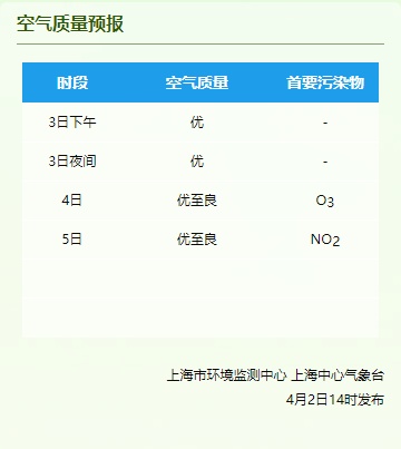 4月3日10时,闵行区AQI为57,良,首要污染物为PM10。24小时AQI为49,优。据上海市环境监测中心预报,今天下午优,夜间优,明天优至良,后天优至良。