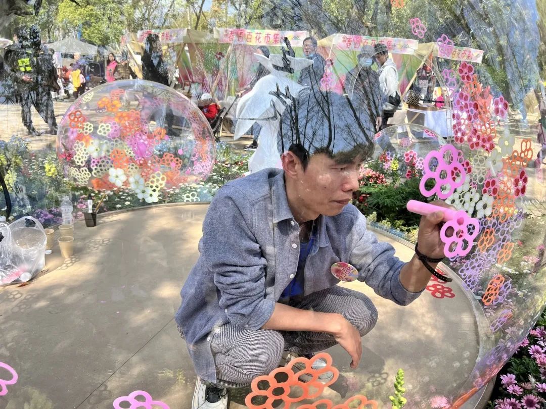 市集一角,一组艺术装置十分“吸睛”。艺术创作者身处玻璃房内,以玻璃为画纸,用色彩描绘春天。创作者袁思文依照自己对“百花”的理解,将其意境用艺术形式加以表达,带给游客视觉享受与美感体验。