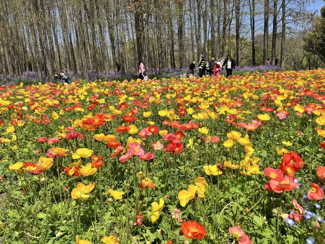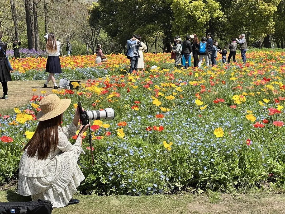 花菱草、幌菊、冰岛丽春......在上海共青森林公园东门区域,近5000平方米的花海正值花期。这片花海一年四季景致不同,每年的3、4月份,这里草花环绕,彩蝶飞舞,黄、橙、蓝各色花朵风情万千。不少市民游客慕名而来,流连在花海中,拍拍美照,定格美好瞬间。