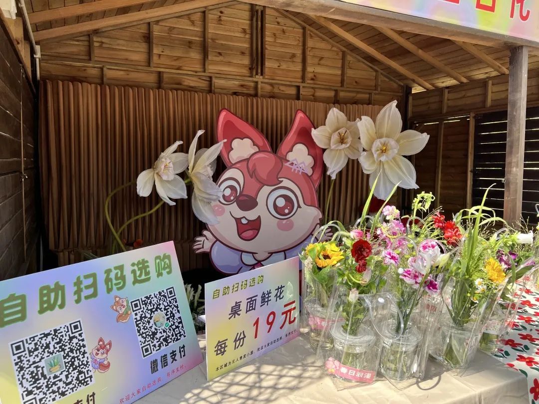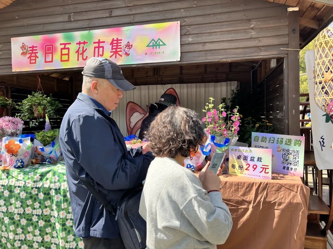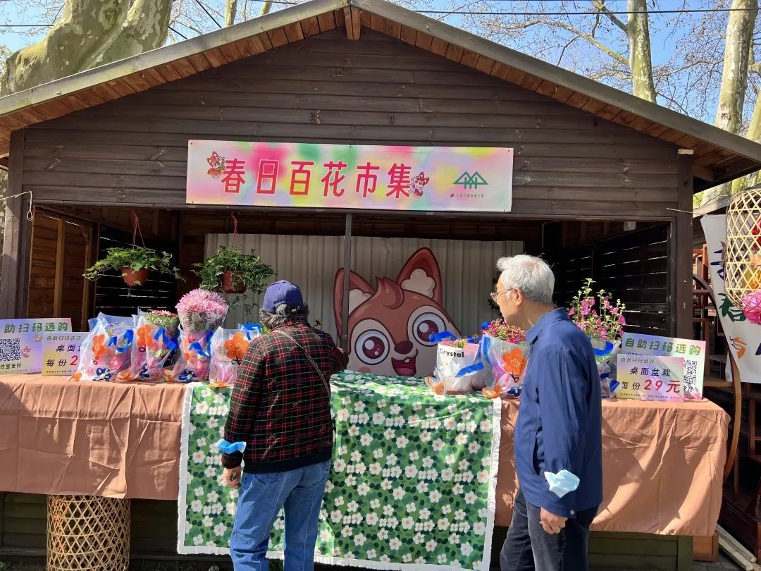 在百花展的“百花市集”上,可以欣赏艺术文创,走进自然课堂。50余家展位各有特色,其中有两间主题花屋采用无人售卖的形式,游客可扫码购买自己心仪的花卉。而花屋的“店长”,则是公园吉祥物“松松”和“果果”——两只憨态可掬、造型灵动俏皮的小松鼠,一就位就迎来不少顾客。