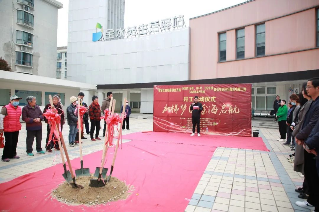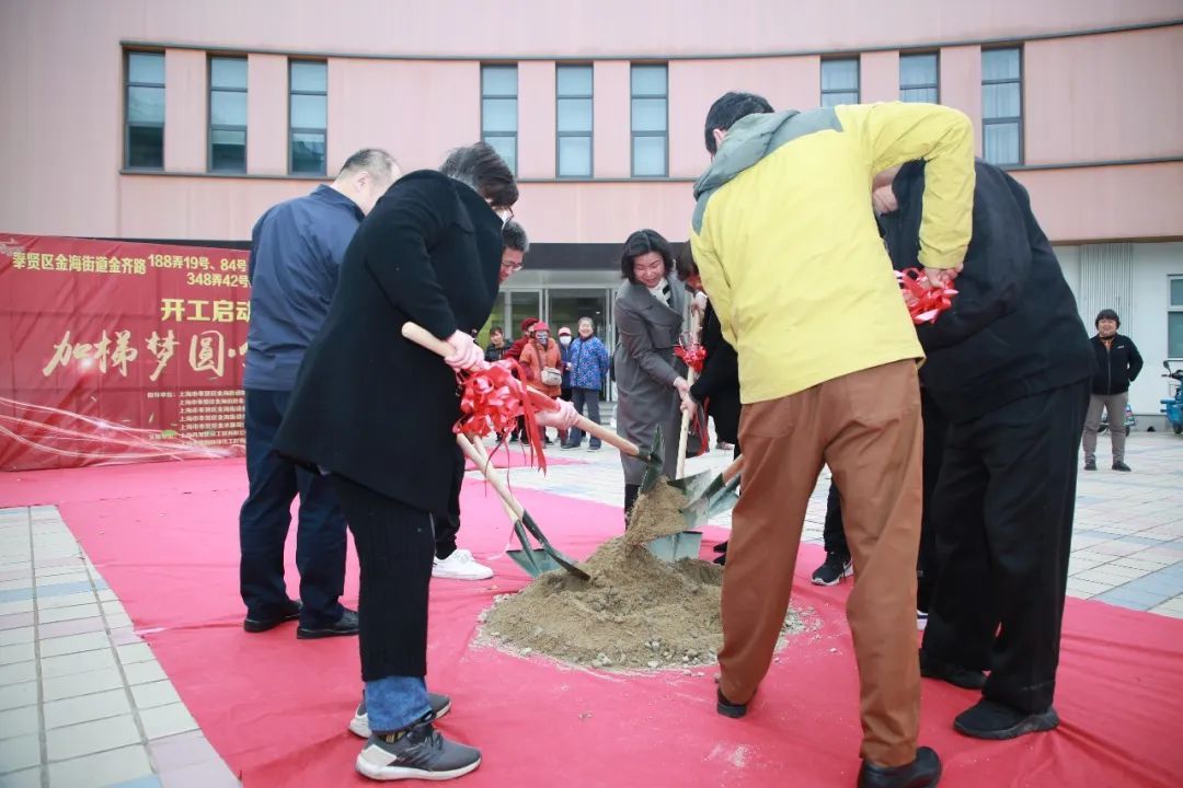 3月29日上午,加装电梯开工仪式在金水苑小区举行,开工仪式现场,金海街道相关部门负责人、居民代表等致辞表示祝贺,挥动铁锹奠基培土。