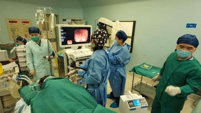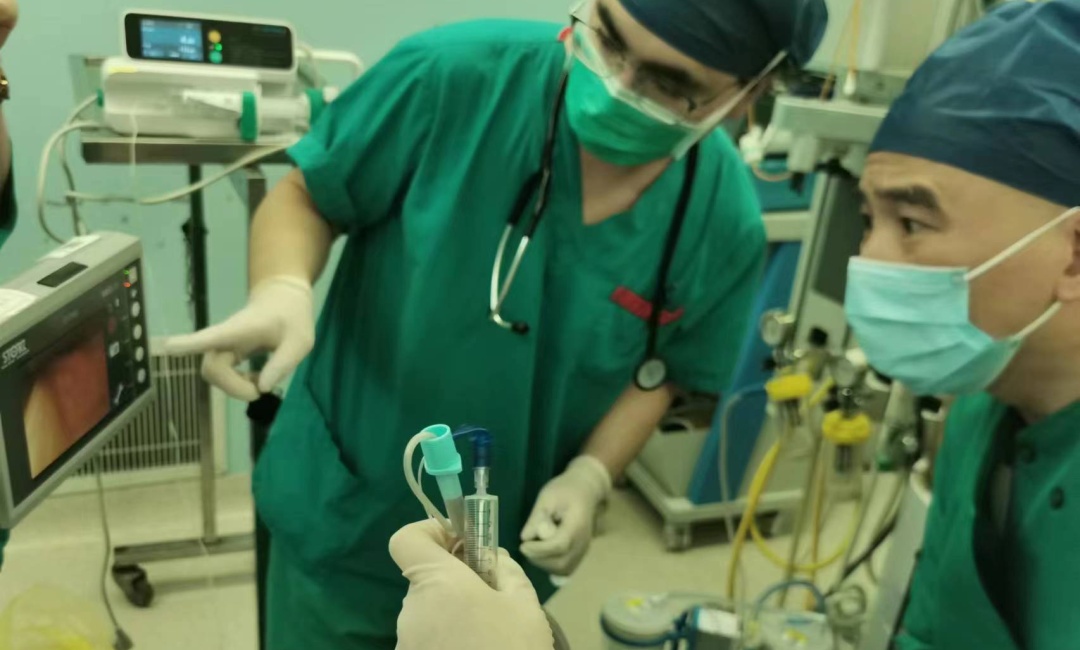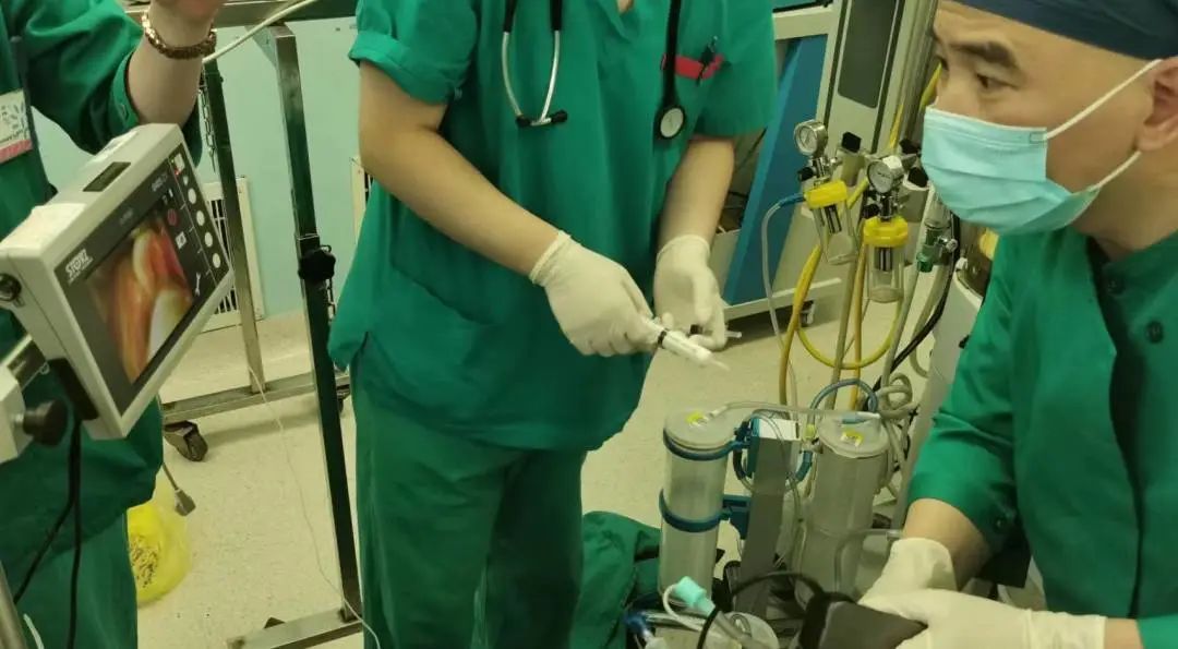 由于患者刚好处于右侧卧位,可以及时防止误吸,张光明主任立即充分吸引后1分钟内完成快速顺序诱导,侧卧位气管插管,为患者建立起生命通道。