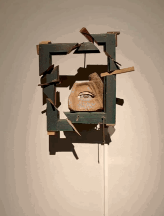《她》也是一件有故事的作品。这是一件用现成木材组合的木雕装置,电机的加入,使装置中的眼睛可以眨动。是材料的展现体现出更多个人经验的痕迹,让材料更具有了温度。
