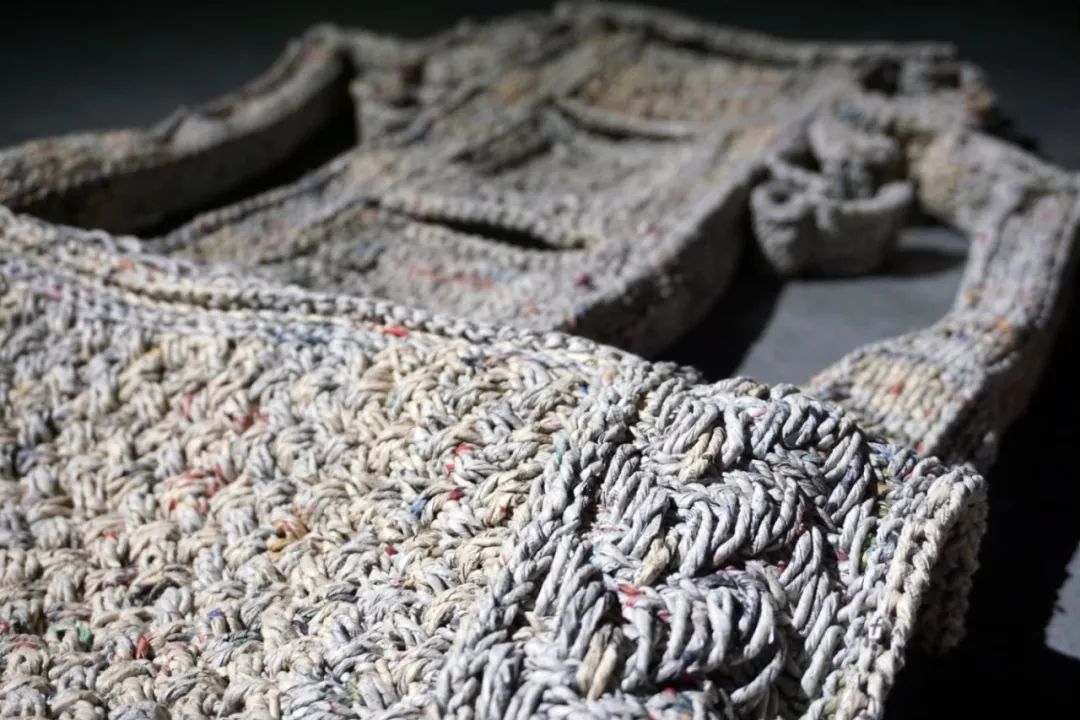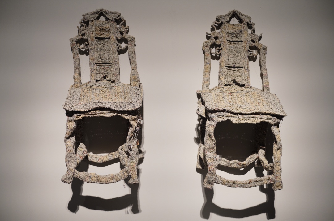 王雷也是因为擅长驾驭材料而得到业界赞誉的雕塑家,他这次仍用旧报纸搓线的方式,编织出了《再见经典》,讲述了一个古今对话的故事。