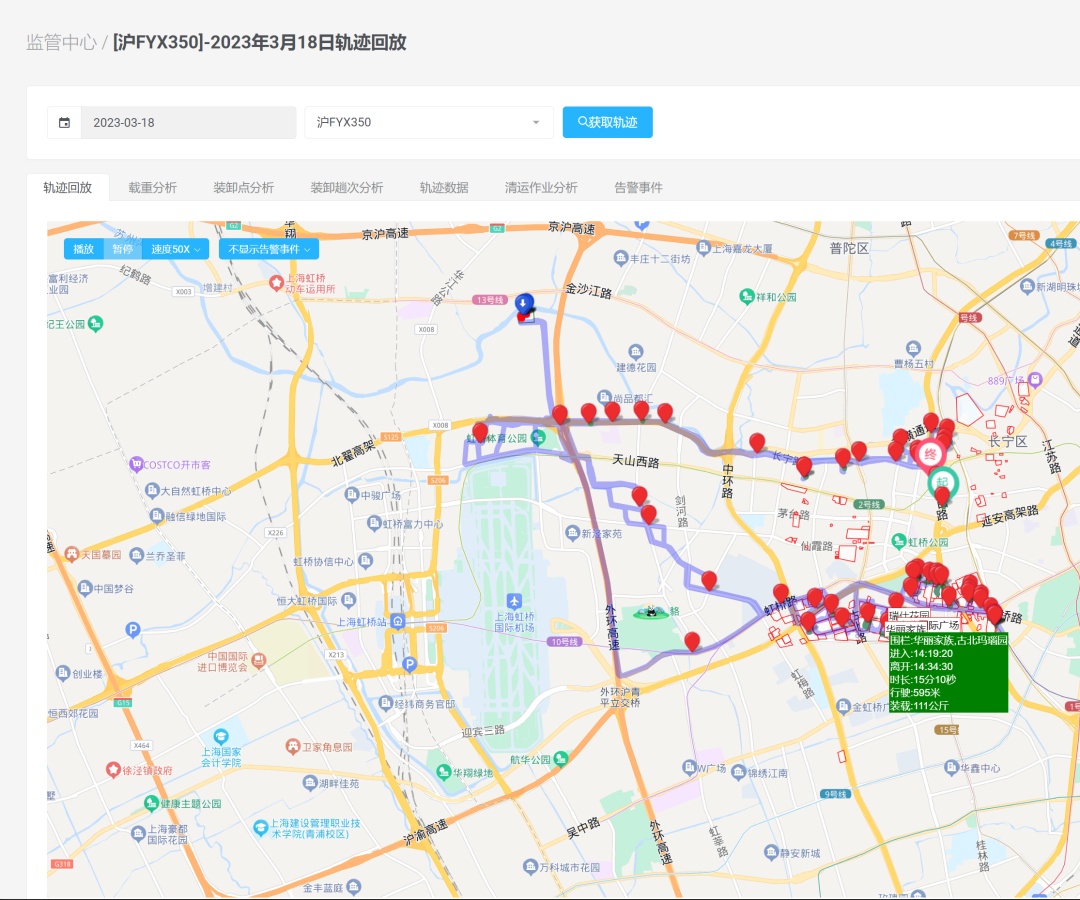 通过实时定位技术,可实现每辆作业车辆的点位及行驶路线清晰可查。清运人员每日出车作业时,进行“线上报到”,到达每个清运点位后,系统可自动识别驾驶员的“签到打卡”动作,并根据打卡点位绘制车辆轨迹。实现了车辆数据、车牌信息、车辆清运点位的信息环环相扣。