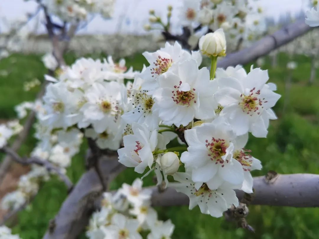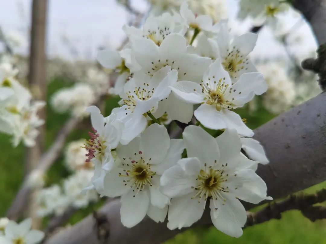 空中俯瞰,梨花迎春绽放,一簇簇雪白的梨花缀满枝头,花瓣在春风的吹拂下不时从枝头缓缓飘落,空气中到处弥漫着梨花的清香。该基地主栽翠冠梨、秋月梨、雪梨等树种,树龄都在15年左右。目前,早熟品种的冠翠梨树盛花期已经结束,秋月梨树、雪梨树花开正旺。作为当地有名的梨树种植专业技术员,王双明与工人们连日来在园里忙着点粉,提高梨树坐果率。“翠冠梨开花早,3月下旬就陆续开放,秋月梨这几天迎来了盛花期。由于今年的气温比去年高一点,开花时间也比去年要早一点,花期可以持续10天左右。根据目前的开花情况,预计今年产量比往年要好,早熟品种6月就能成熟,6月下旬可以采收上市。”王双明说。