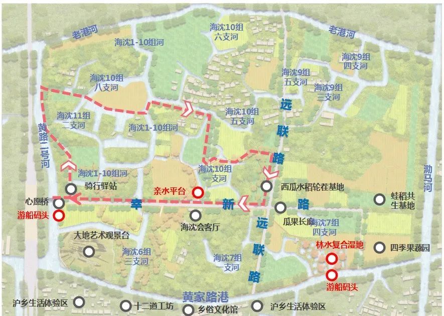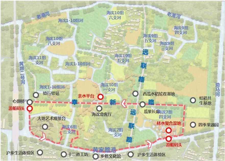 心愿桥→游船码头→大地艺术观景台→落杉林染→四季果蔬园→蛙道共生基地→瓜果长廊→海沈会客厅→游船码头→心愿桥。路线全长2.2km,游览时长30min。
