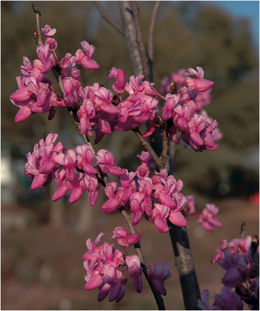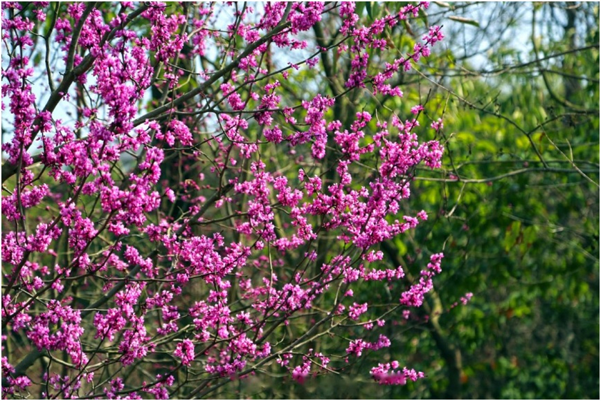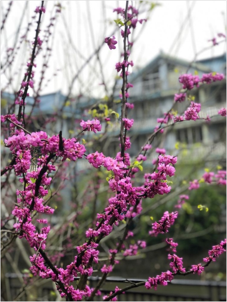 早春时节,庭院中的紫荆先花后叶,姹紫嫣红,正如宋代诗人朱翌的《咏紫荆》诗云:“鹤骨龙筋结寿枝,红绡紫绮曝仙衣。只应不奈麻姑爪,独领春风住翠微。”在紫荆家族中,就有这样一种枝曲花艳的紫荆——黄山紫荆。