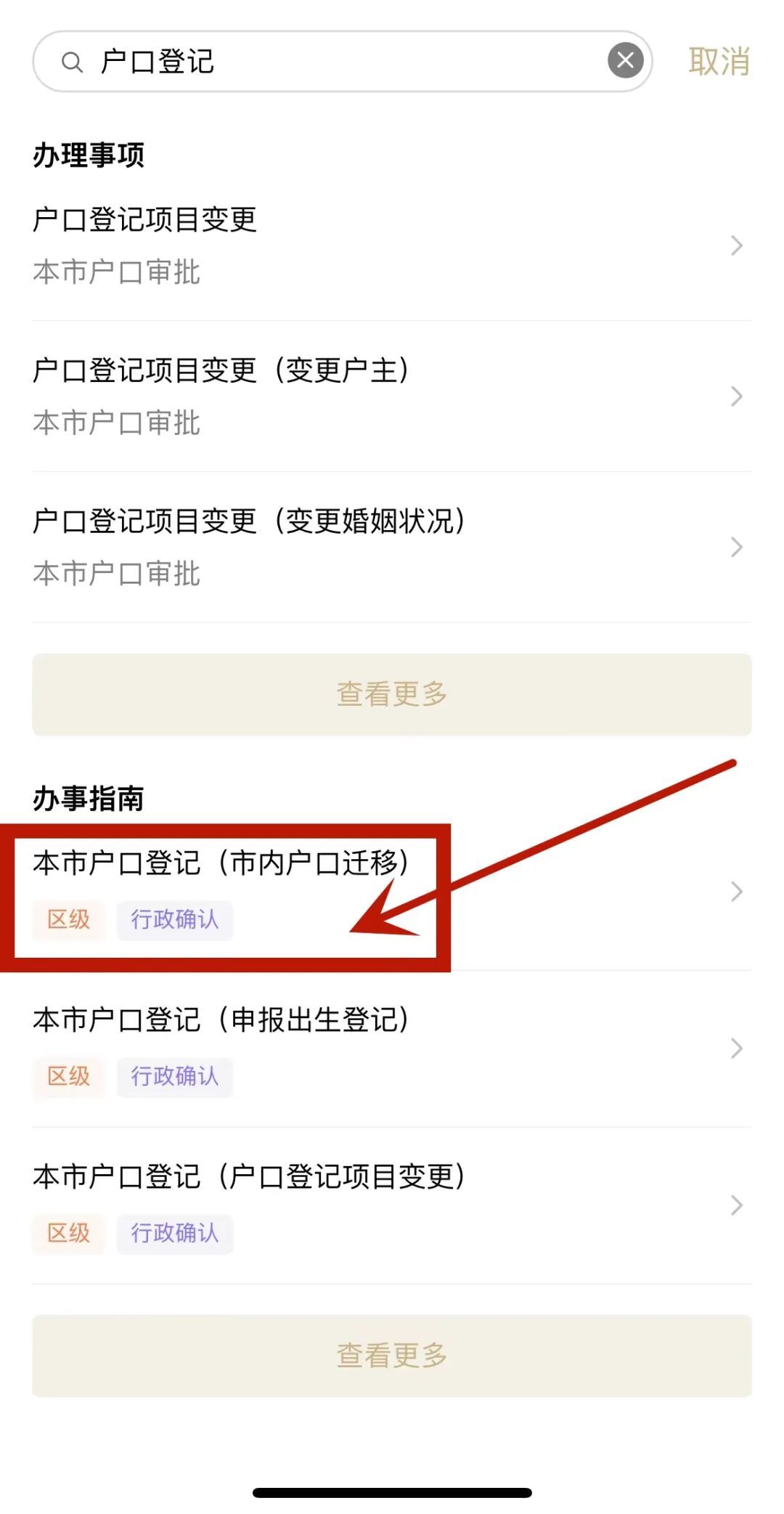 第一步:打开随申办,搜索“户口登记”,下滑至办事指南“本市户口登记(本市户口迁移)”点击进入;