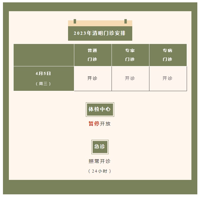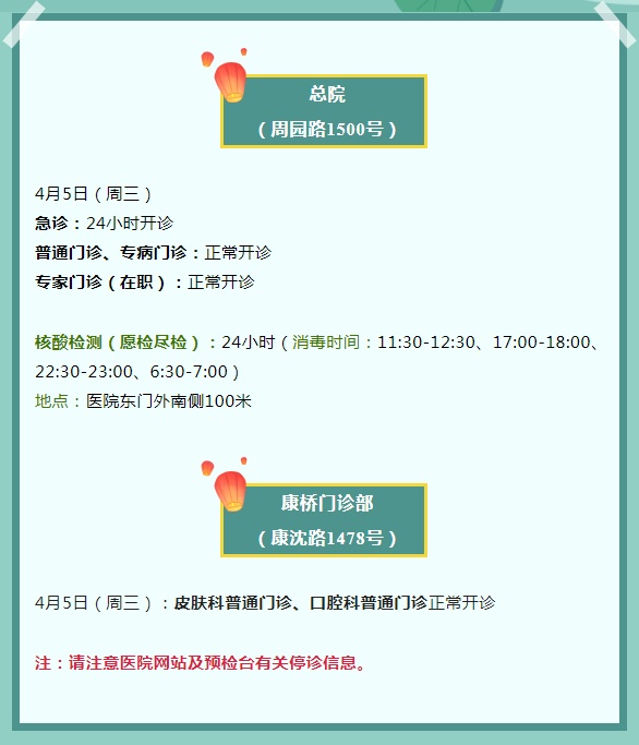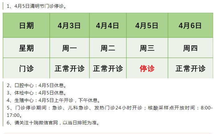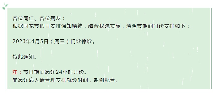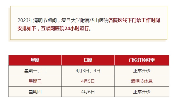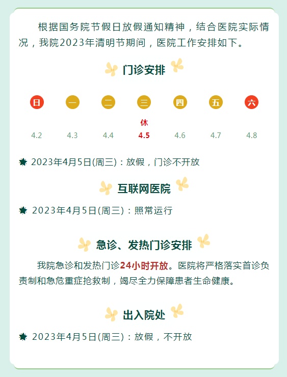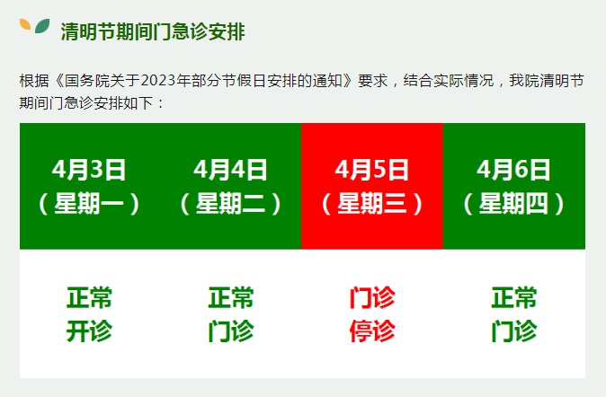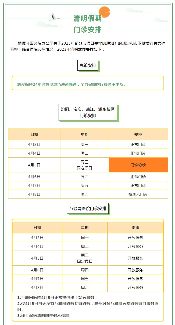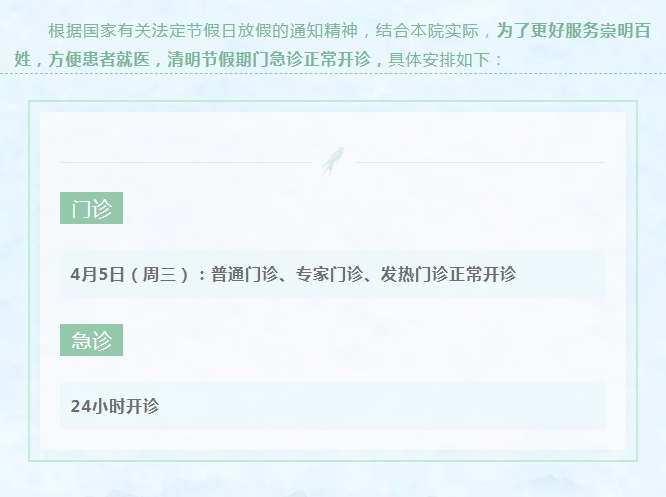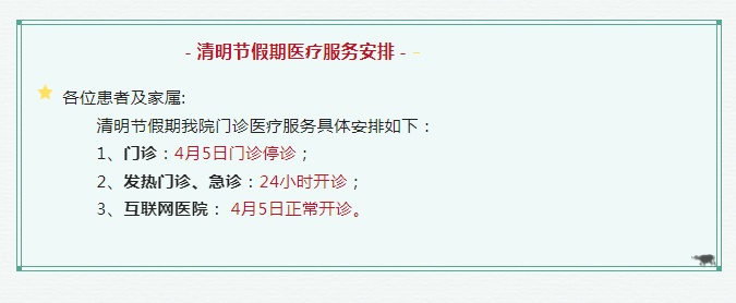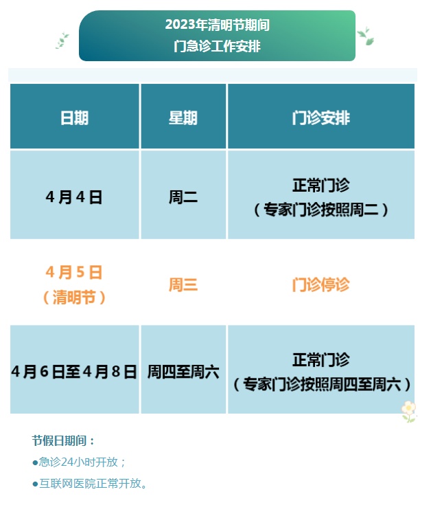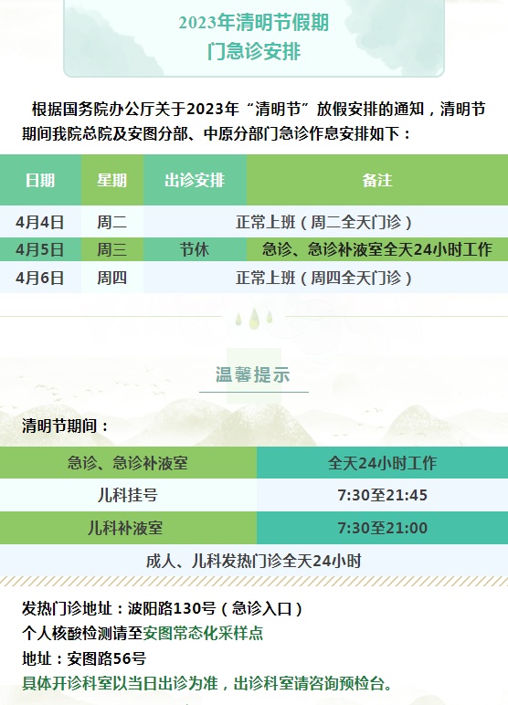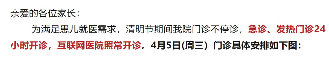 节假日期间急诊、发热门诊、儿科门急诊24小时开诊,互联网医院照常开诊。