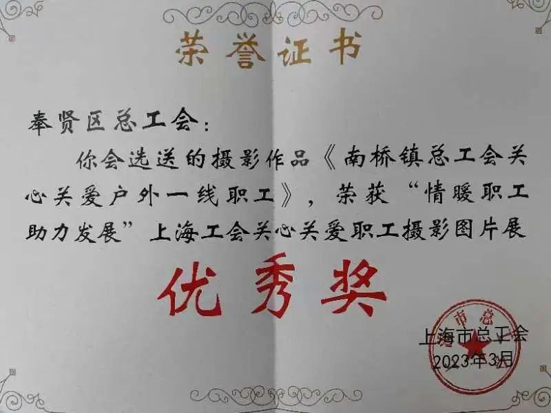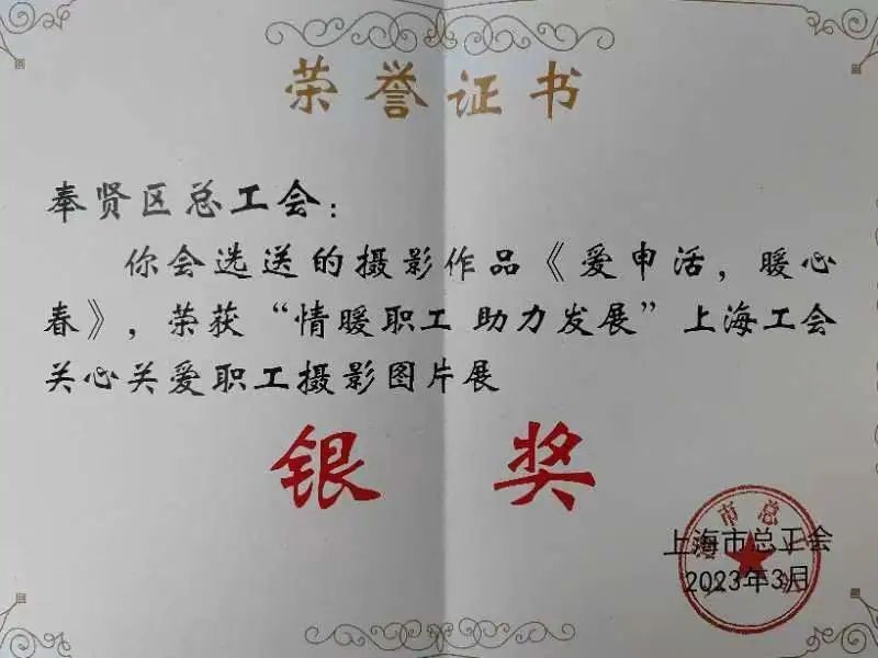 今年1月,上海市总工会面向全体职工,广泛征集工会关爱一线职工的美好瞬间,以此激励我们更好地情暖职工,助力发展。征集历时一个多月,上海市总工会从222家单位、40余个产业局工会选送的700多张作品中遴选出了100张入围投票作品,其中奉贤区总工会选送的5张优秀作品入选投票,并经过2月13日-16日的网络集中投票,有2张摄影作品获奖!奉贤区总工会也在本次活动中因组织发动有力而喜获“优秀组织奖”!