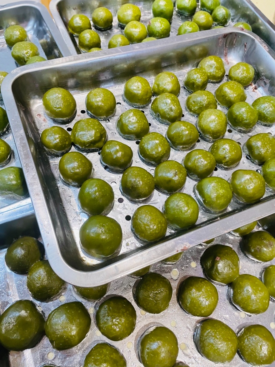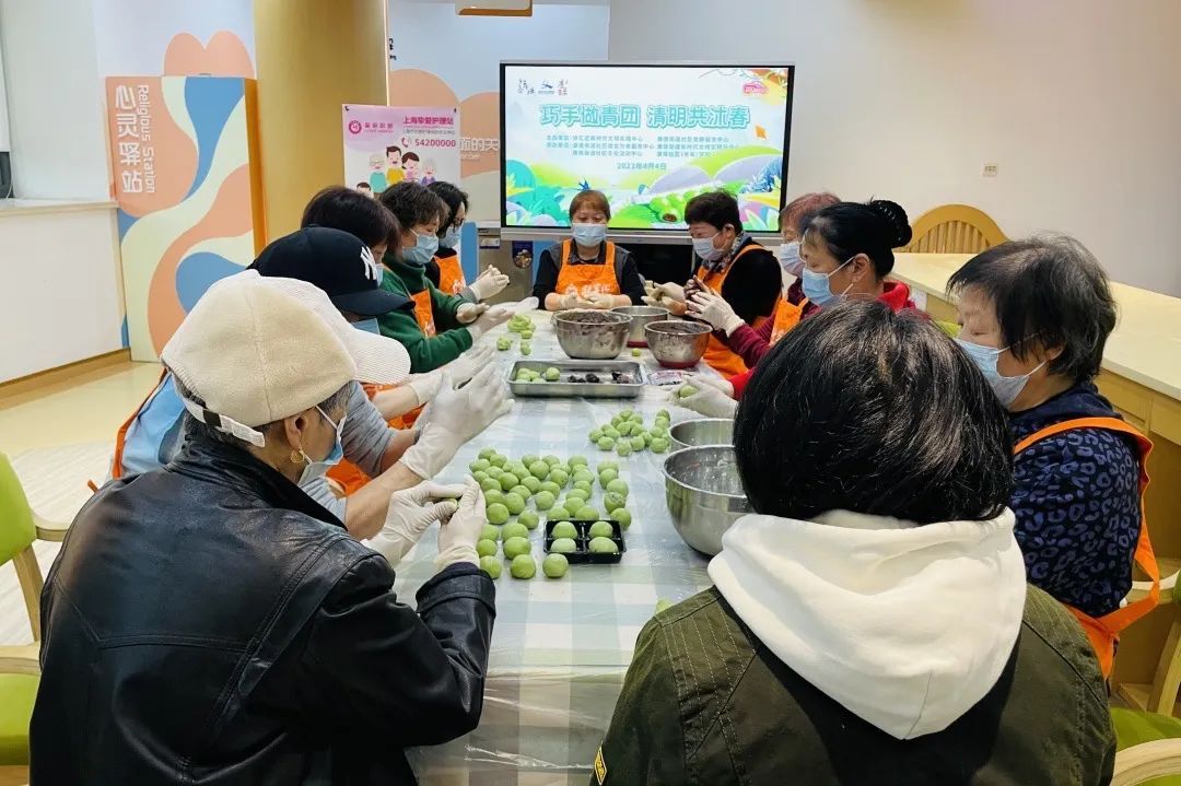 来自康健街道的居民志愿者们撸起袖子,展现出各自的巧手厨艺。大家一边动手制作青团,一边互相交流着上海传统文化,气氛和谐融洽。很快,碧绿的青团制作完成了,进锅蒸煮。片刻,青团新鲜出炉,清香四溢。