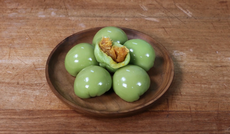 取出40克的青团皮、20克的豆沙和20克咸蛋黄肉松馅心,分别包入青团皮,然后把青团捏成圆型。