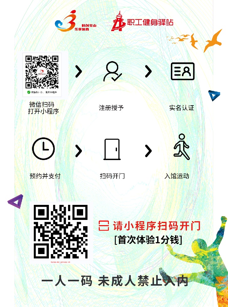 用手机扫描二维码进入微信小程序,完成注册预约并支付,再对准门上二维码扫码进入,运动结束时费用从手机端自动扣除。