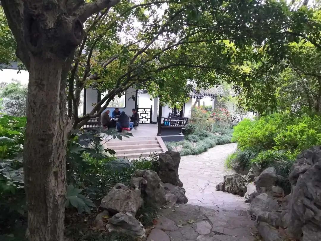 茶室与扑克桌上的交谈声引起了记者的注意。沿着小路往前走,三两成群的人们正坐在飞香厅茶室中闲谈品茗;旁边的石凳上,两桌四人扑克吸引了人们围观。