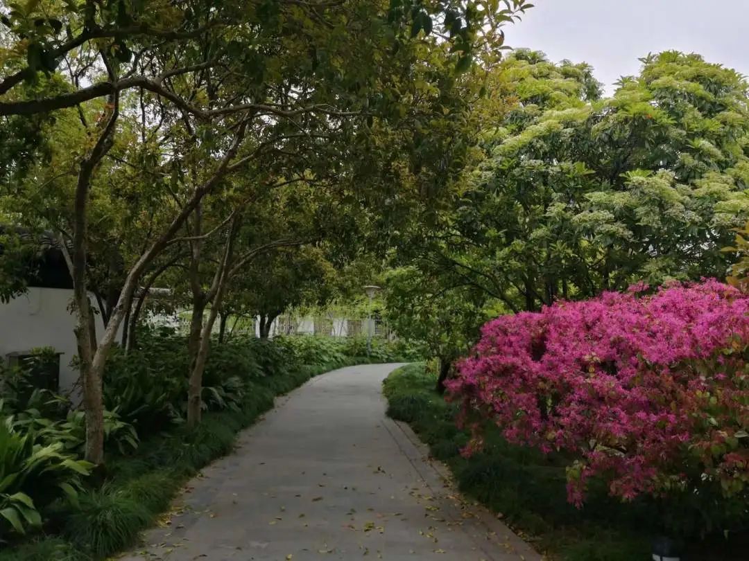 玫红色花瓣与含笑、罗汉松等常绿灌木、乔木交相辉映,更显春意盎然。一对老人相携并肩走在步道上,左右的鲜花绿植衬出幸福的背影。