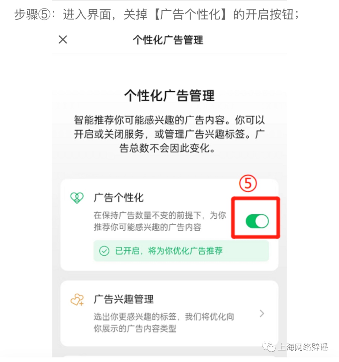 目前,微信已经对此进行简化,并通过“腾讯安全中心”的官方小程序予以公示。不过,从公示内容看,仍旧要经过5个步骤才能关闭“个性化广告”。