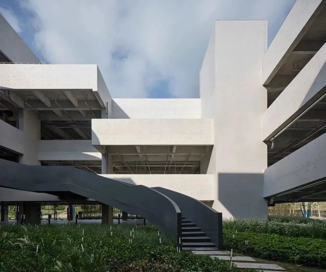 立体停车库建筑主体采用错层框架剪力墙与预应力悬挑结合的结构形式,与错层楼板共同围合出核心的景观庭院空间,其内部纯粹的空间与流线完整的外化,在立面呈现出优雅的流线线条,通过增强建筑本身的特征性与空间的宽适应性,在上海这座高密度的城市里实现别样的停车体验。