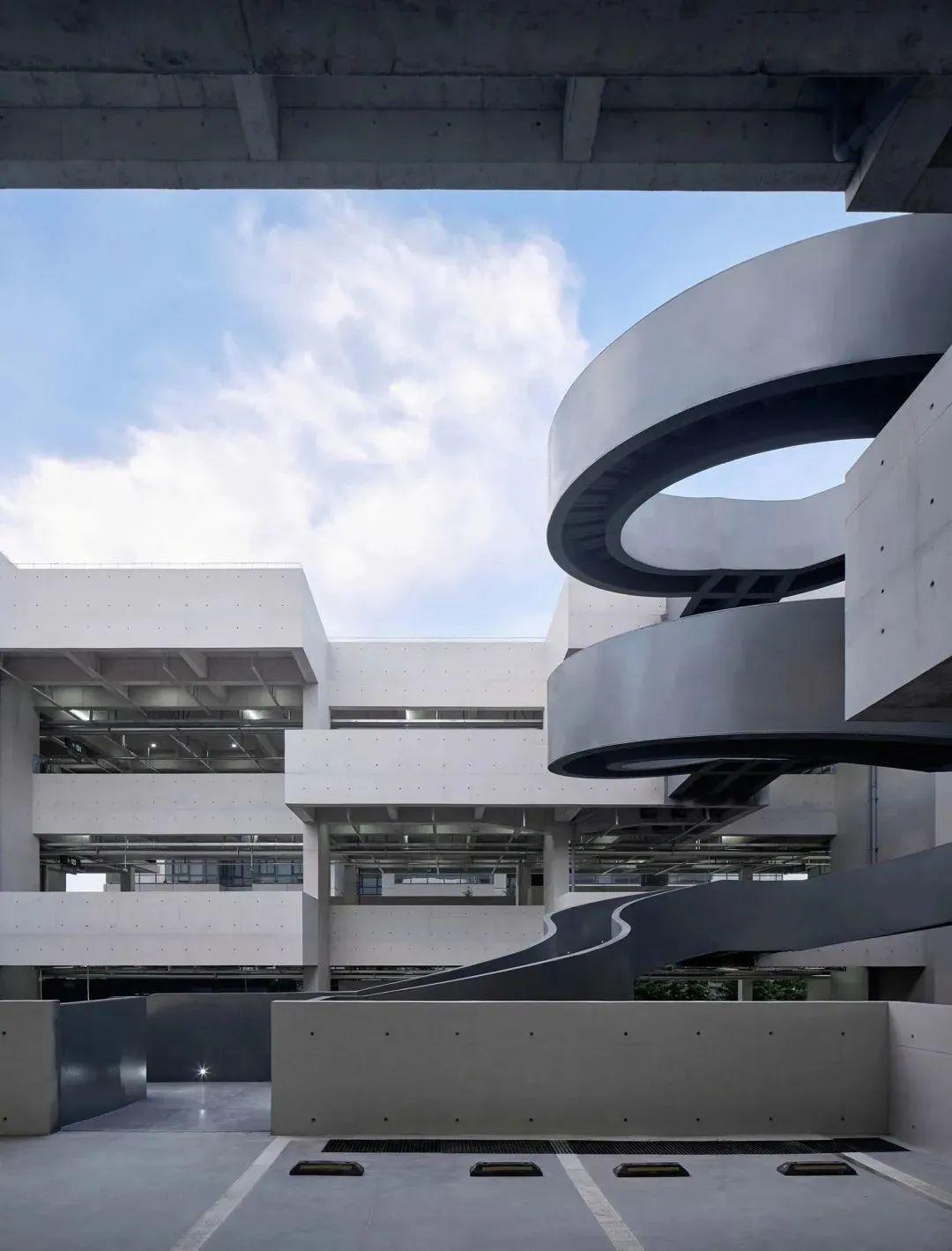 立体停车库建筑主体采用错层框架剪力墙与预应力悬挑结合的结构形式,与错层楼板共同围合出核心的景观庭院空间,其内部纯粹的空间与流线完整的外化,在立面呈现出优雅的流线线条,通过增强建筑本身的特征性与空间的宽适应性,在上海这座高密度的城市里实现别样的停车体验。