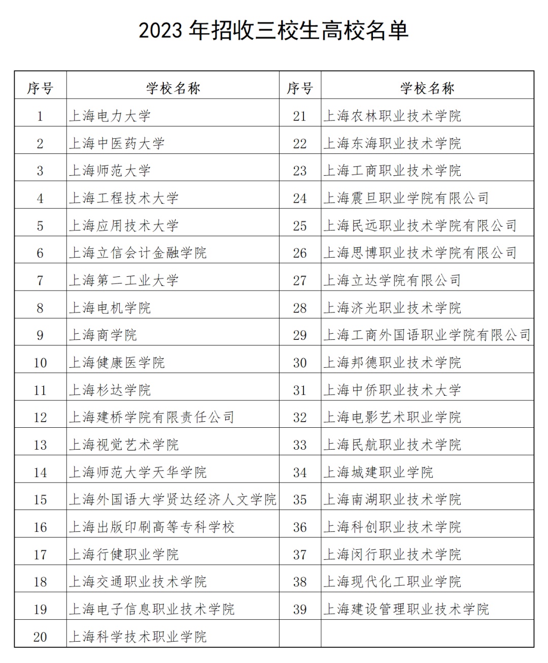 本市共有39所高校参加2023年三校生招生,未列入名单的高校不得招生。开展中高职贯通培养模式试点、中等职业教育—应用本科专业贯通培养模式试点的相关高校须安排三校生招生计划。各招生院校的招生专业须经市教委审批同意或备案。