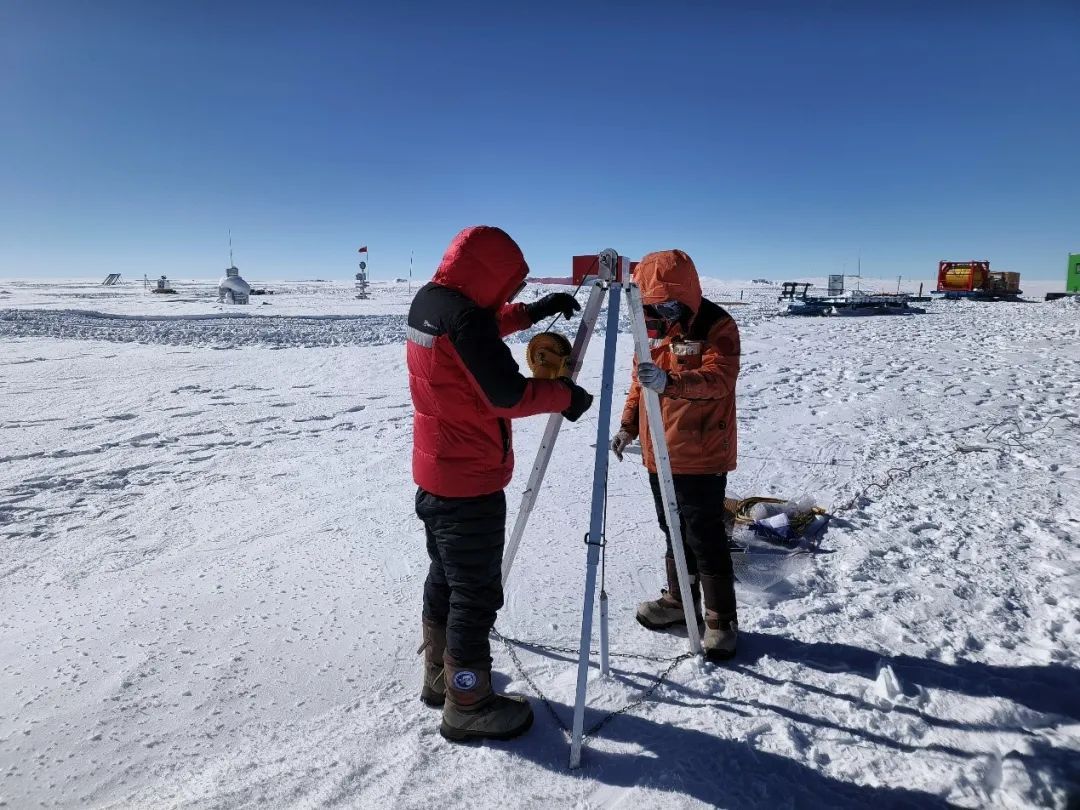 顾元元和曹哲毅在团队的帮助下,在内陆沿线上安装多条20m温度链,完成内陆沿线的物质平衡与全球海平面变化关键参数(垂直温度)的观测,为粒雪密实化模型的温度模拟提供验证,同时有助于长时间观测冰盖温度变化趋势。在冰盖安装80m金属复合链,为我国主被动微波技术在极地环境下开展科学验证提供保障。