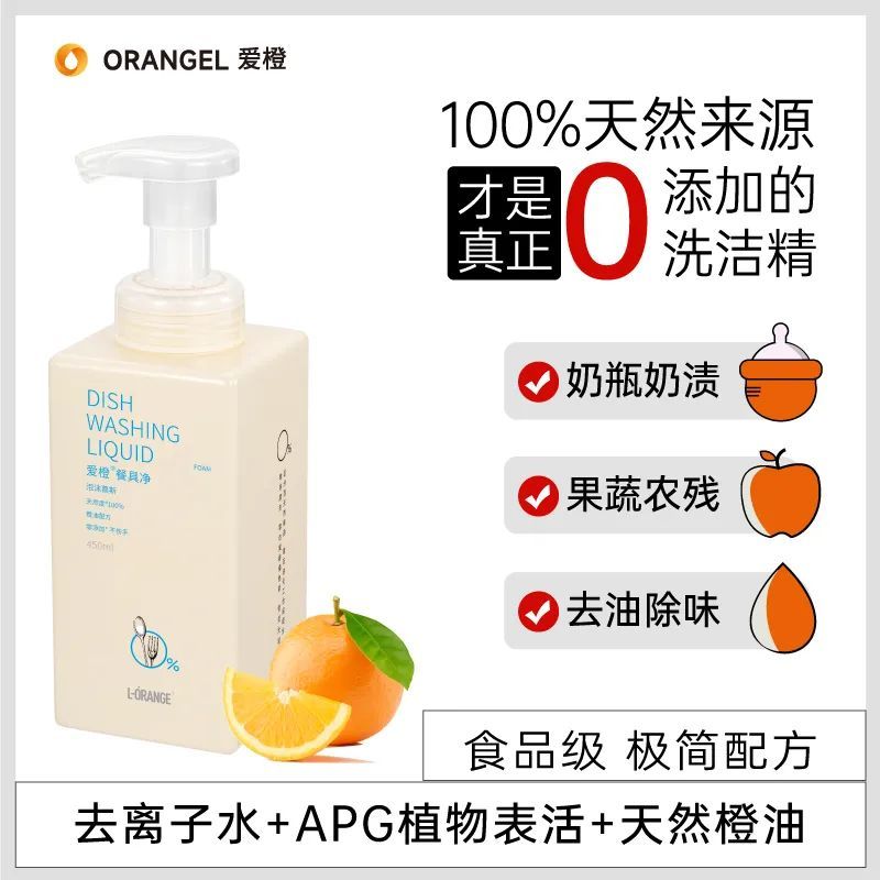 爱橙系列主攻居家清洁,全系列产品100%天然植物来源配方,利用橙油的天然属性达到强效去油、抑菌制菌的目的。代表产品:餐具净、果蔬净等。