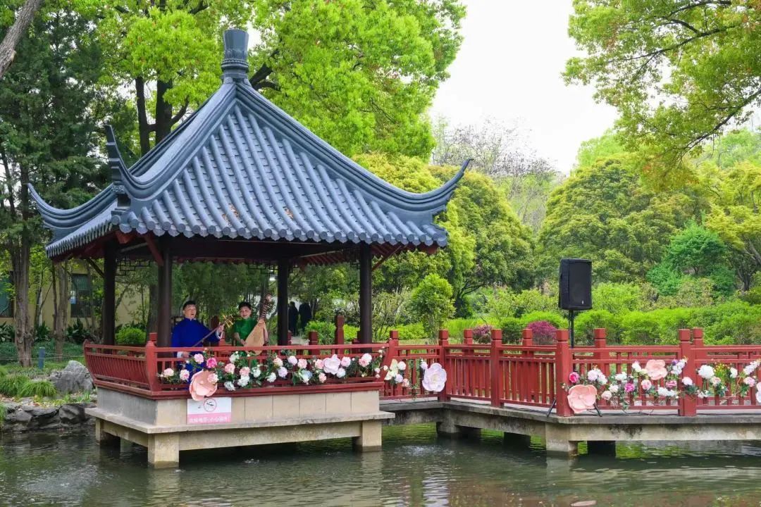 游园会以“满园春·繁花”为主题,园内不仅有各式牡丹可以欣赏,还有许多精彩的活动及文艺表演更是让游客流连忘返。沉浸式评弹演出正是此次游园会的亮点之一,评弹艺术家们以唱、说、弹的形式,生动地演绎经典评弹曲目,将牡丹文化与传统音乐完美结合,展现了一幅幅动人的画卷,让游客在赏花的同时感受到传统戏曲的魅力。景中有曲、曲中有景,评弹与园林共同展现了一幅江南好风光。