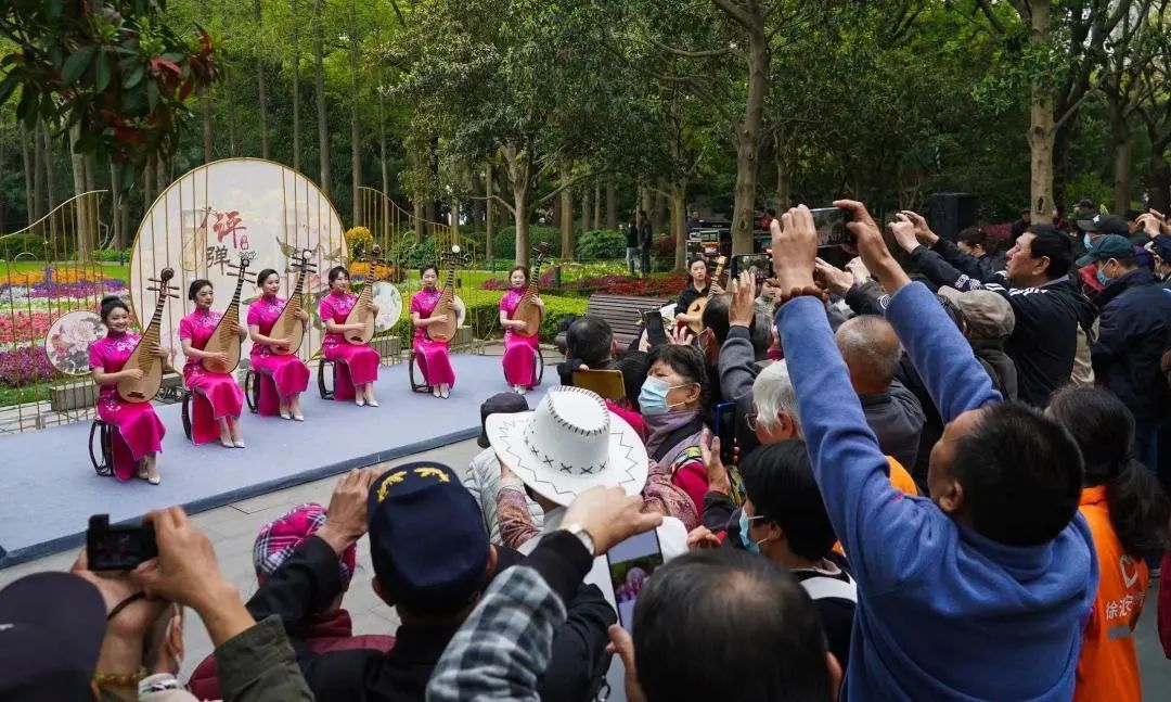 跟随着人流走进公园大门,漕溪公园正门口的牡丹花镜处,不少市民正在围观。寻声望去,一桌两椅,琵琶三弦,娓娓道来景与情,一曲嗲嗲糯糯的《春已归》让人感受到春风日暖、万物随生的蓬勃景象。
