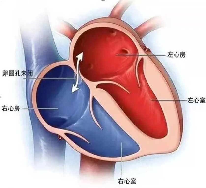 卵圆孔是胎儿期心脏房间隔的一个生理性通道。当宝宝还在妈妈肚子里的时候,肺部是不张开的,静脉血不能通过肺部,而是通过卵圆孔直接从右侧心脏进入左侧心脏,进而供应大脑、肾脏等全身各器官。卵圆孔一般在婴儿出生后1年内闭合,若3岁后仍不闭合称卵圆孔未闭。成年人中,大约25%的卵圆孔不完全闭合,但多数很小,不会引起临床症状。