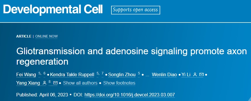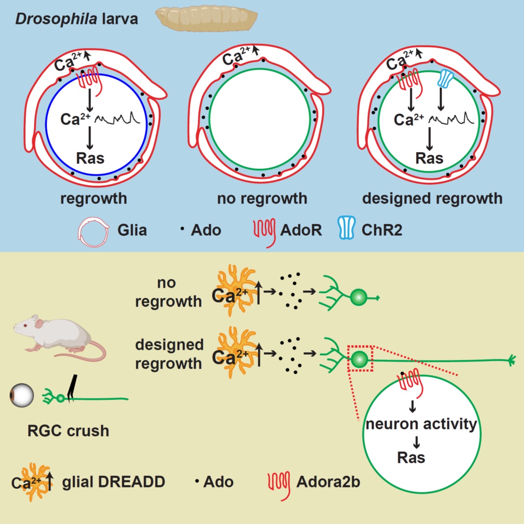 2023年4月6日23点,Developmental Cell期刊在线发表题为《胶质细胞传递和腺苷信号通路促进神经损伤再生》的研究论文。该研究由中国科学院脑科学与智能技术卓越创新中心(神经科学研究所)李毅研究组与美国麻省大学医学院的相杨团队合作完成。该研究以果蝇幼虫和小鼠作为研究的模型动物,发现了胶质细胞在神经轴突损伤后再生中发挥积极作用,揭示了胶质细胞通过释放腺苷递质(Adenosine,Ado)激活神经元的高频放电及下游Ca2+-Ras通路,进而促进轴突再生的分子机制。该研究为进一步理解胶质-神经细胞相互作用提供了新思路,为神经再生领域的应用研究提供了新靶点和新策略