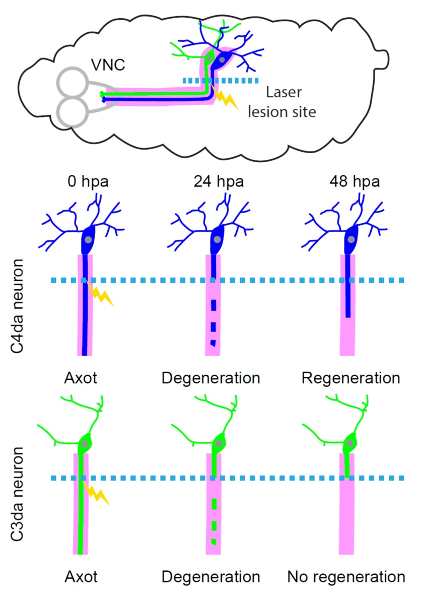 图一:利用局部的高强度双光子显微镜激光,特异切割果蝇幼虫体壁一种或多种亚型的神经轴突,但仍保留包裹这些感觉神经轴突的胶质细胞(紫色),从而研究后续的轴突再生及胶质-神经细胞相互作用机制。果蝇幼虫不同亚型的感觉神经在损伤后轴突再生能力不同:伤害性感觉神经元(C4da神经元,蓝色)具有再生能力,而在同一支神经轴突束的温和机械感觉神经元(C3da神经元,绿色)则没有再生能力。