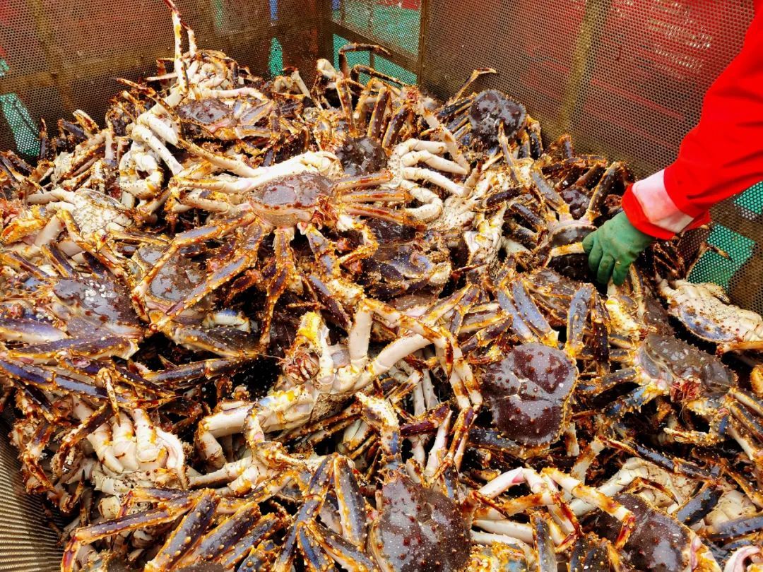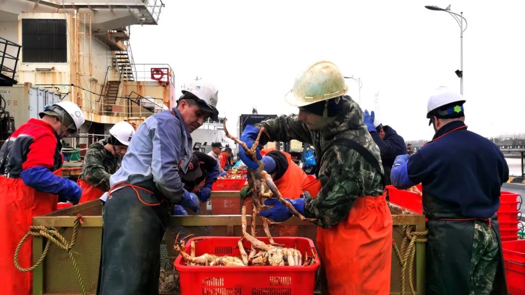 “贝林”轮庞大的身影旁,塔吊机械刚把装满帝王蟹的铁笼放下,俄罗斯籍船员和渔港工人便围上前来,紧张有序地开展帝王蟹卸货作业。