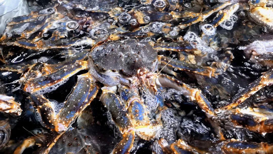 帝王蟹个头硕大、生性凶猛,虽然刚经历一场“长途旅行”,其中不少已恢复活力,不安分起来。当前帝王蟹销售十分火爆,不少经销商早已下好订单,派车辆人员到港口等待,待相关手续和检查完成,便当即开展装运作业,实现“码头直达餐桌”;其余帝王蟹则进入恒温2℃的海水暂养池内“养精蓄锐”,以备后续转运。