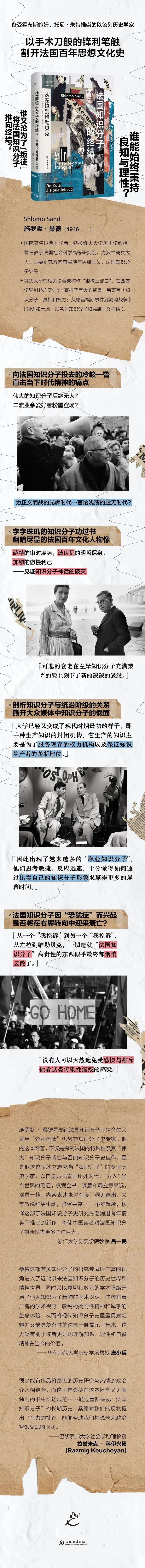 桑德作为一位犹太历史学家,既无比关切民族主义话题和以色列的政治现实,又对法国知识分子投去“他者”的批判眼光。《法国知识分子的终结?从左拉到维勒贝克》这部作品,承载着他对“知识分子精神及本质”的思考。