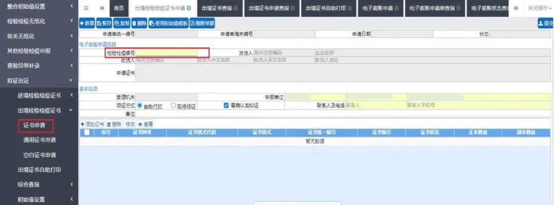 在检验检疫编号栏输入检验检疫编号,系统会自动调用电子底账信息,反填发货人、收货人等字段。申请人按照字段录入要求,录入申报关区、联系人等字段。点击表体的“添加证书”按钮,可以添加该电子底账所需单证里的证书。