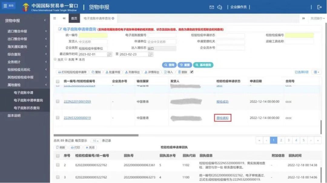 实用TIPS:检验检疫申请状态栏可以显示申请数据的当前状态,点击状态文字如“报检成功”、“查检通知”等(图4),下方会出现该份申请数据的具体回执信息,便于企业更详细了解申请进程。
