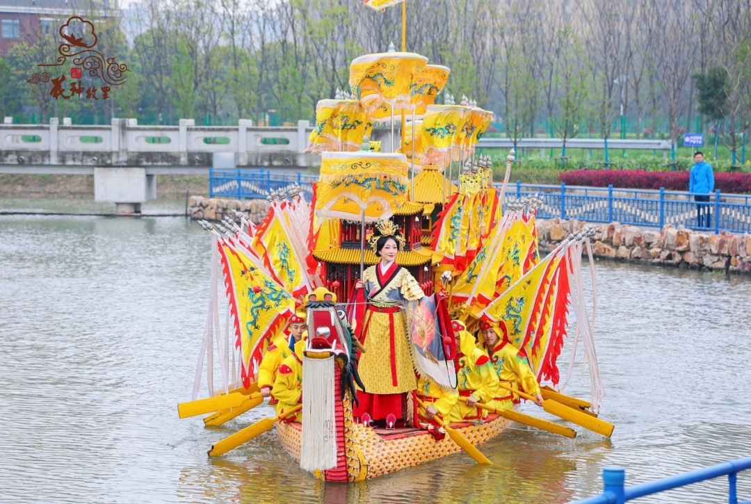 满目金黄、水波粼粼,在大自然描绘的春景图中,非遗罗店龙船载着花神缓缓而来,与十二花仙一起为棉树赏红,绕棉树祈福,送来春天的消息。
