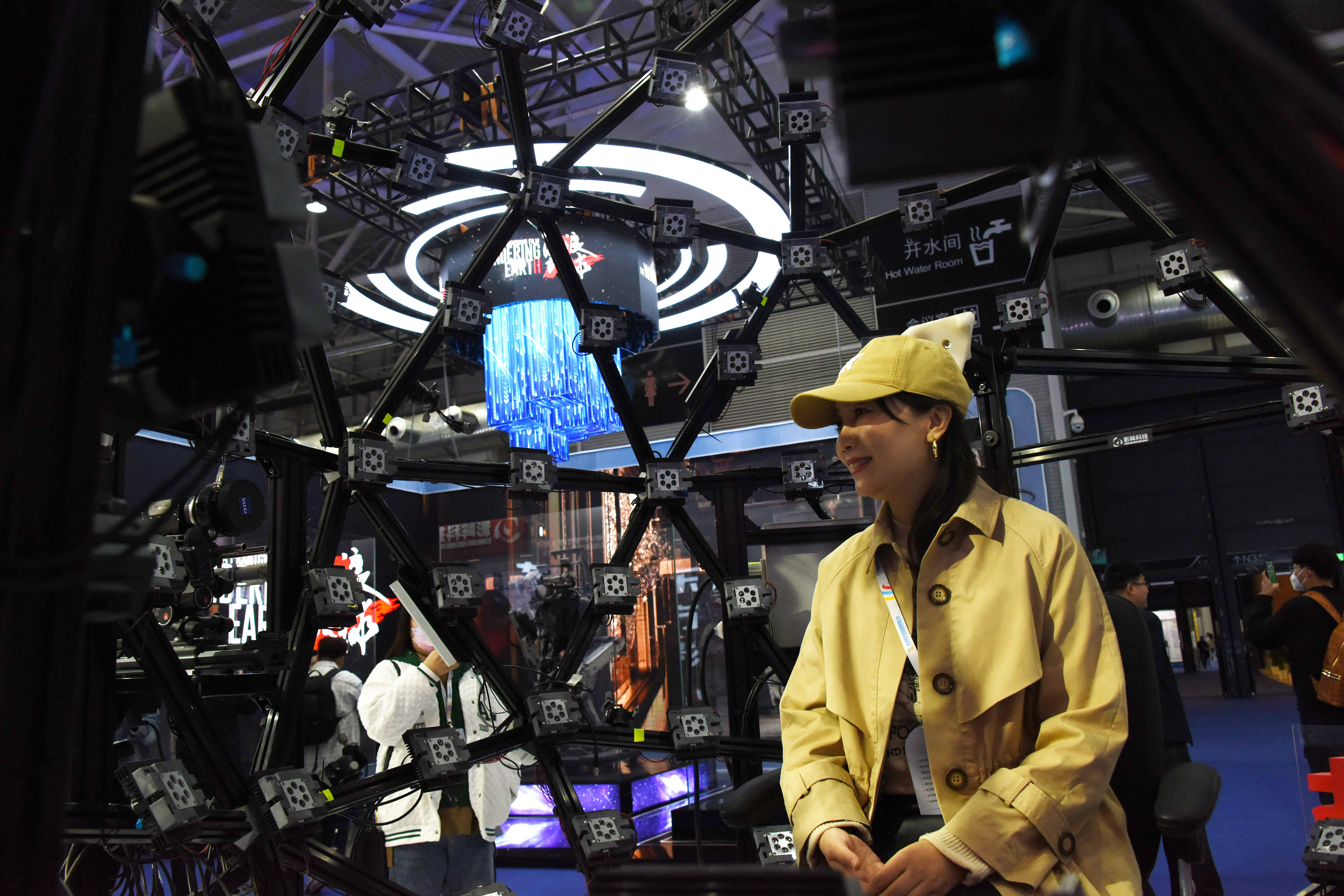 在“科影未来”融合体验展现场,一个直径5米多的黑色球形框架夺人眼球。仔细观察,球体内部每一个连接点都有一部相机,可以实时捕捉人在球体内的动作变化。这是影眸科技展示的“穹顶光场”。进入球体坐下,相机从各个角度进行拍摄,留存面部表情、动作特征等数据资料。3天后,“穹顶光场”就能生成一个全新“数字人”形象。