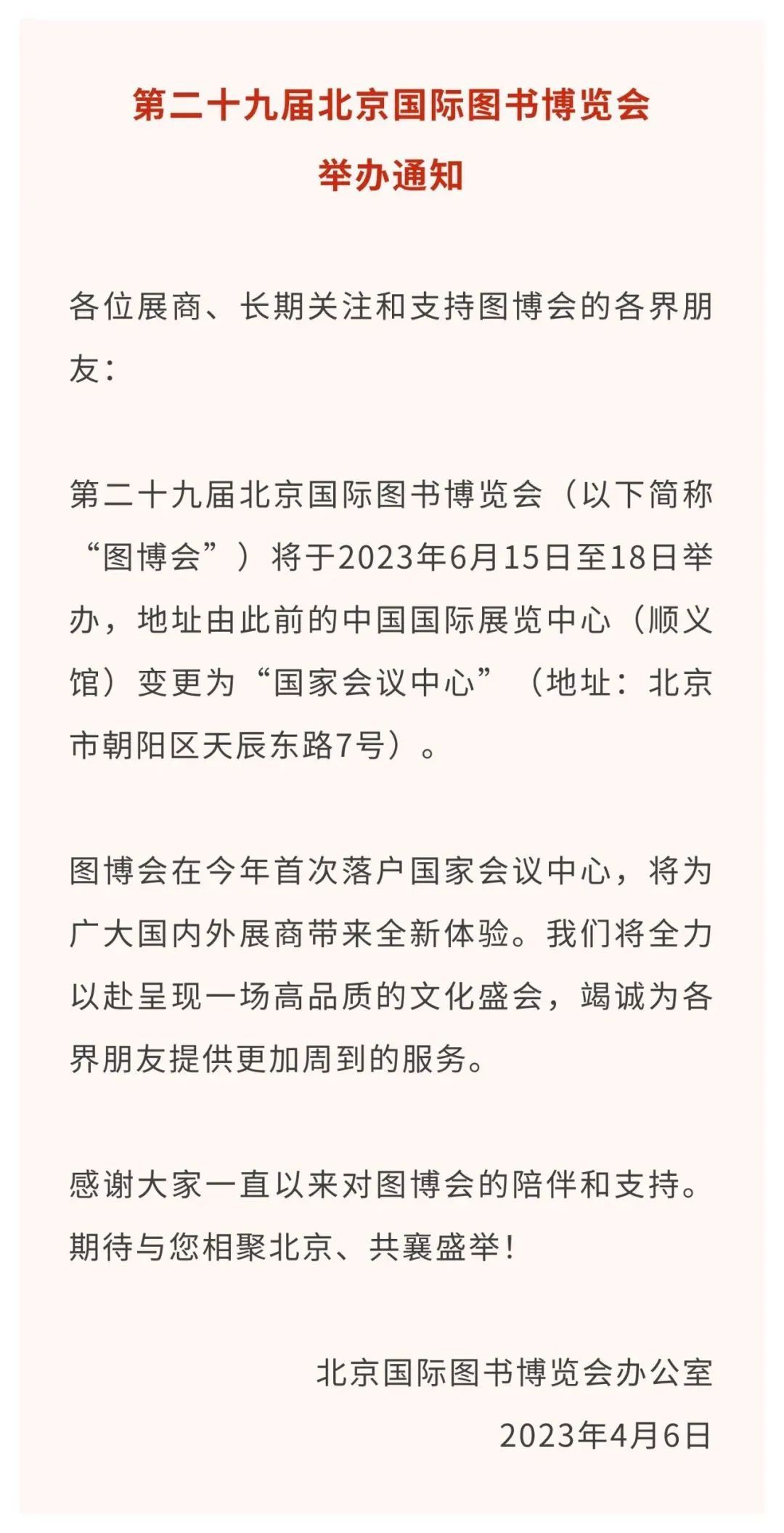 4月6日,北京国际图书博览会办公室发布通知,第二十九届北京国际图书博览会将首次落户国家会议中心(北京市朝阳区天辰东路7号),于6月15日至18日举办。