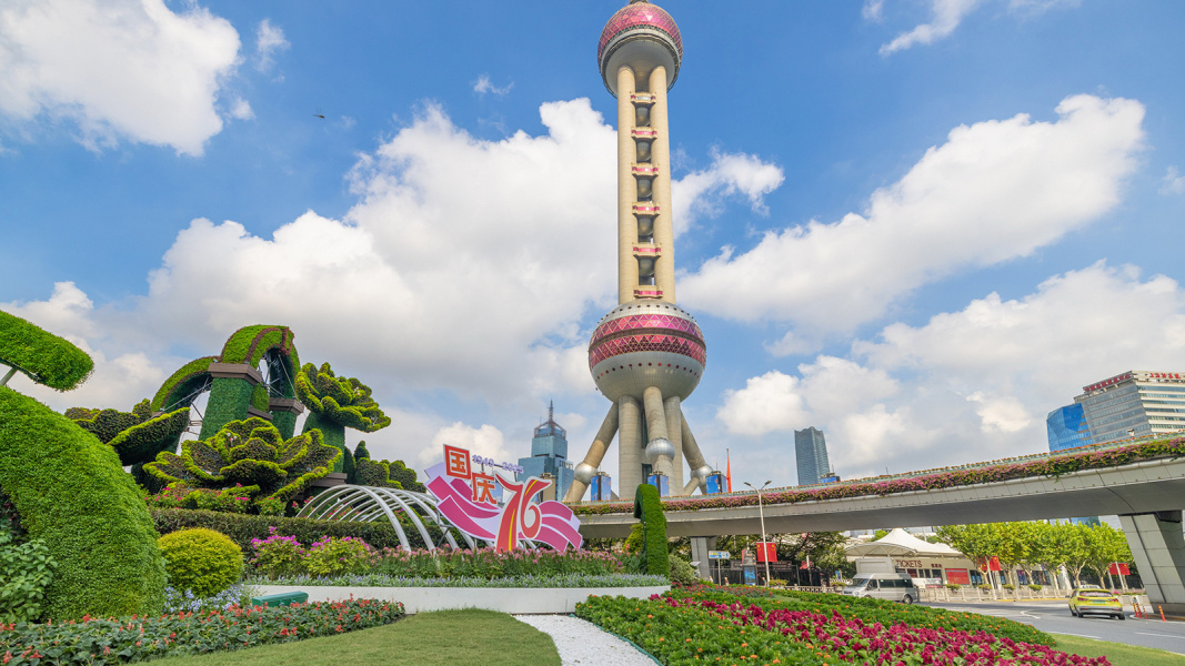 浦东街头花开正艳,国旗飘扬喜迎国庆