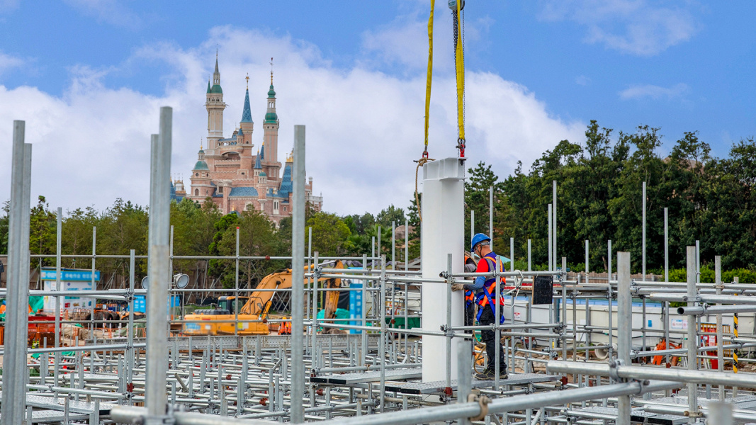 上海迪士尼蜘蛛侠主题园区首根垂直钢柱安装完成,高速过山车设备安装正式启动