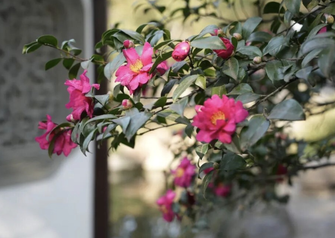 古猗园茶梅绽放,冬日园林添浪漫