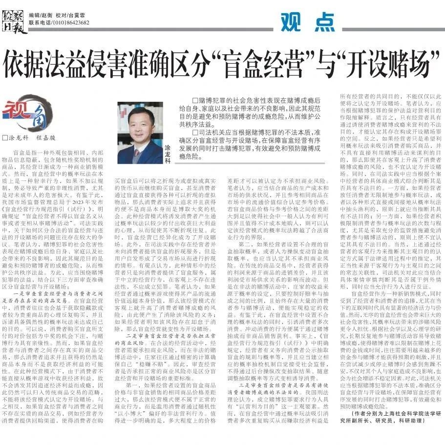 【智库声音】检察日报 | 涂龙科:依据法益侵害准确区分“盲盒经营”与“开设赌场”