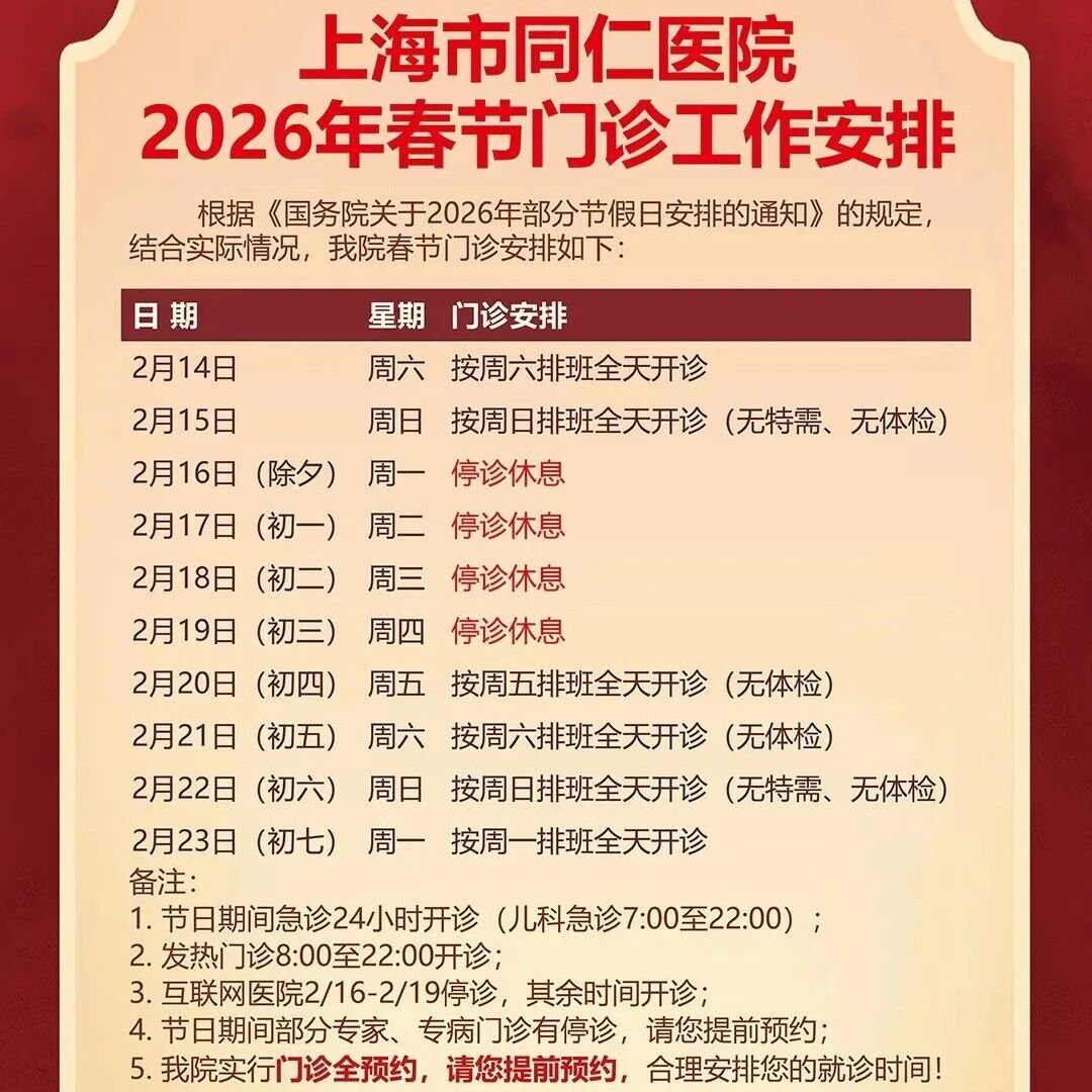 【通知】上海市同仁医院2026年春节门诊工作安排